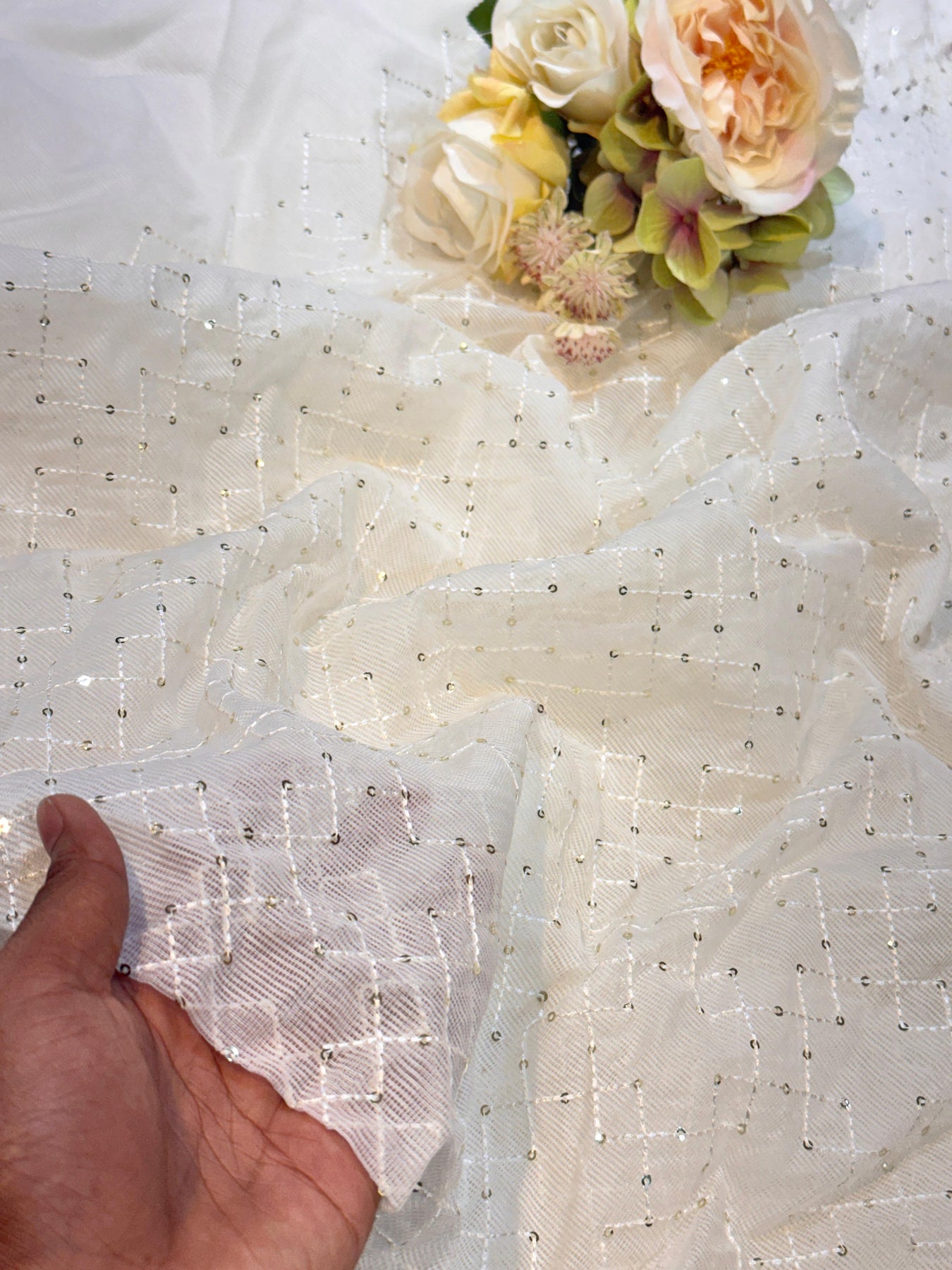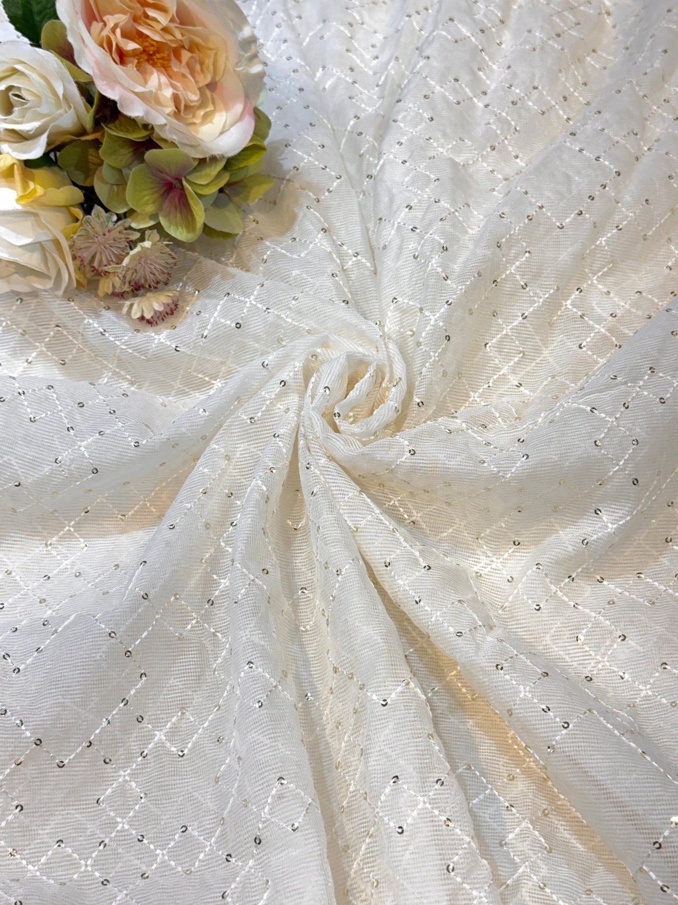 Pure cotton Kota checks fabric with intricate embroidery detailing, perfect for creating elegant suits, kurtis, gowns, and traditional wear. This dyeable 44-inch wide fabric and 33 inch embroidery width offers versatility in color customization to match your design vision. The lightweight, breathable cotton construction ensures comfort for everyday wear, while the classic checks pattern adds timeless appeal. Ideal for both casual and formal garments, this fabric combines traditional craftsmanship with practical wearability. |