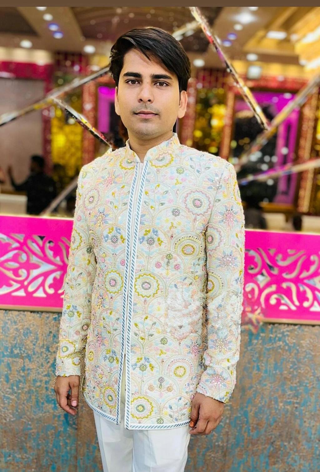 Enhance your wardrobe with Suhavi Zari Tissue Handwork Embroidery fabric. Perfect for creating elegant gowns, suits, blouses, sherwanis, and more with its 44 inch width. Elevate your style with delicate handwork and superior quality. |