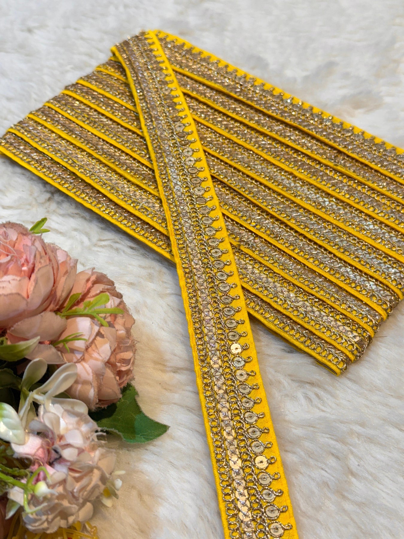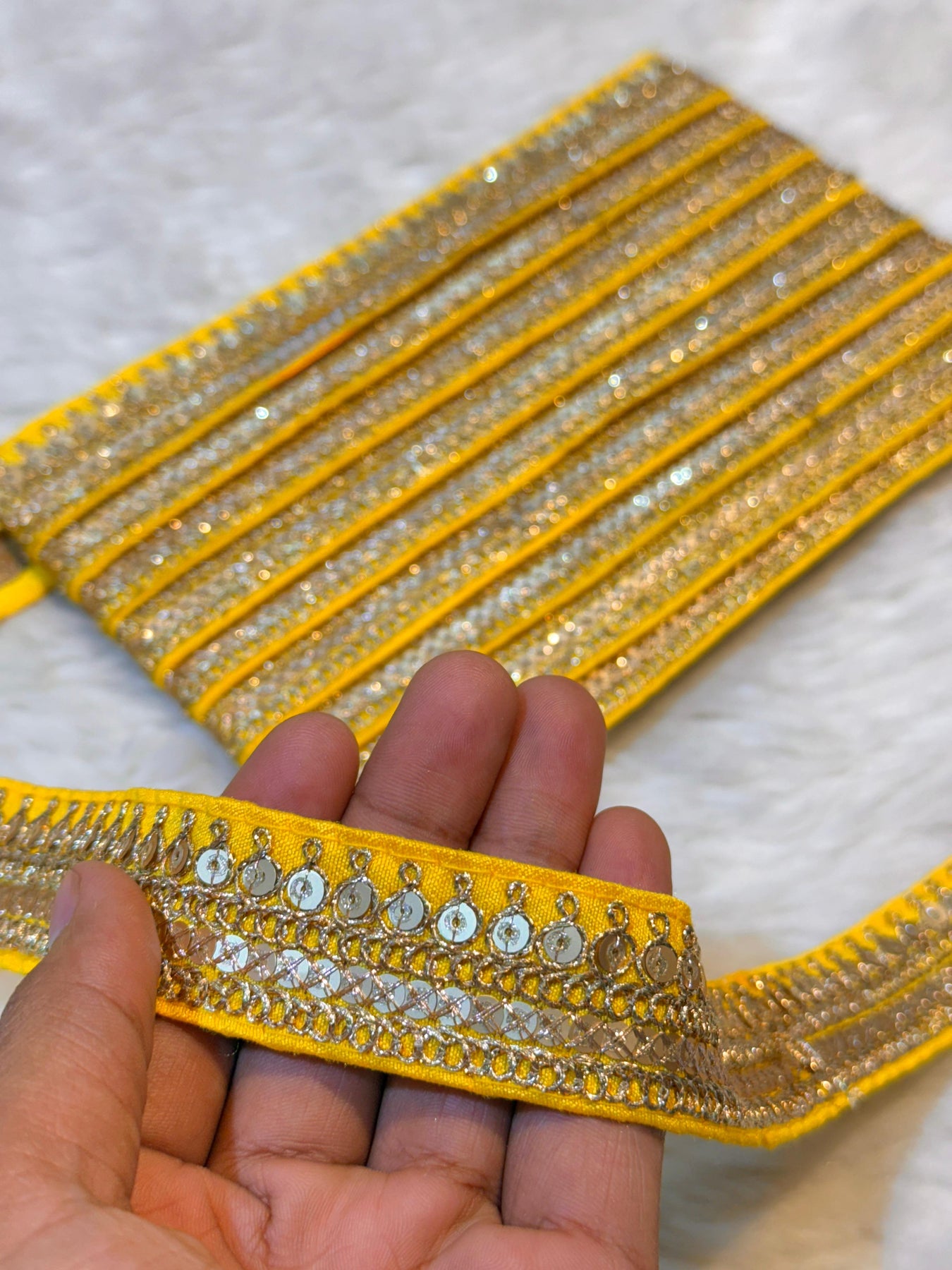 Elevate your textile designs with this premium yellow lace border featuring intricate sequins work. This wholesale pack delivers 9 meters of versatile trim, ideal for embellishing dupattas, sarees, and custom garment construction. The delicate lace combined with shimmering sequin detailing adds sophisticated dimension to any piece. Perfect for designers and manufacturers seeking quality borders that enhance both traditional and contemporary wear. Transform your creations with professional-grade embellishment that catches light beautifully. |
