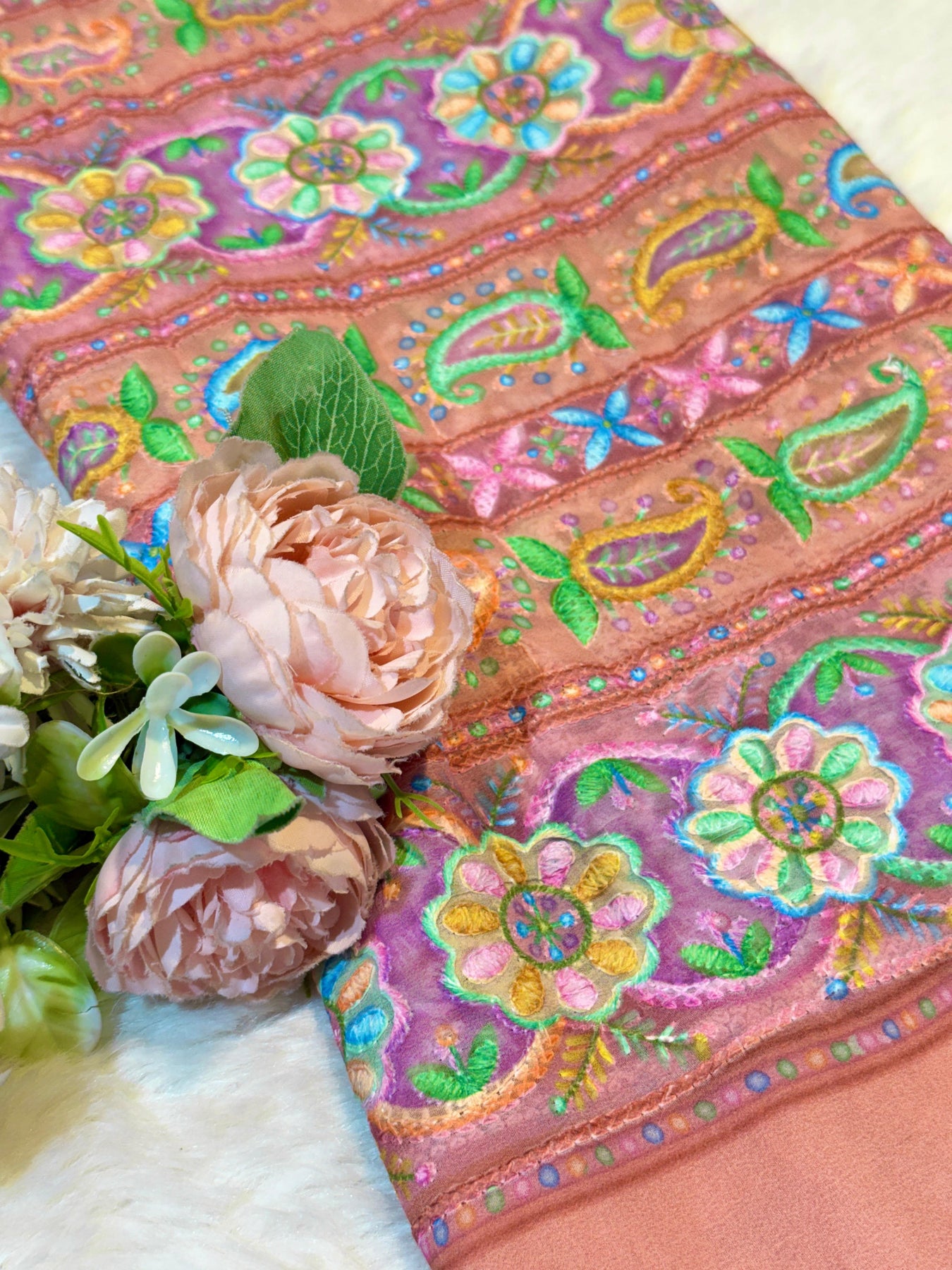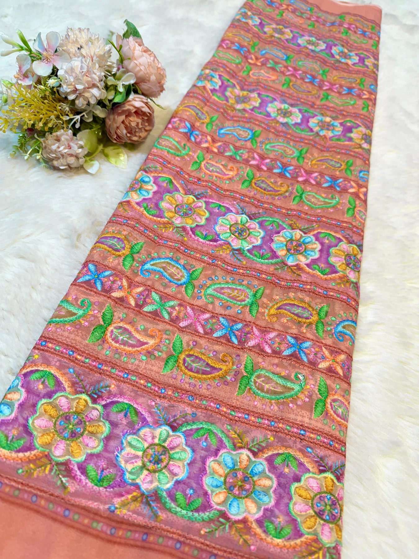 Peach Georgette Chikankari Stripe Floral Threadwork Embroidery 44 inch width