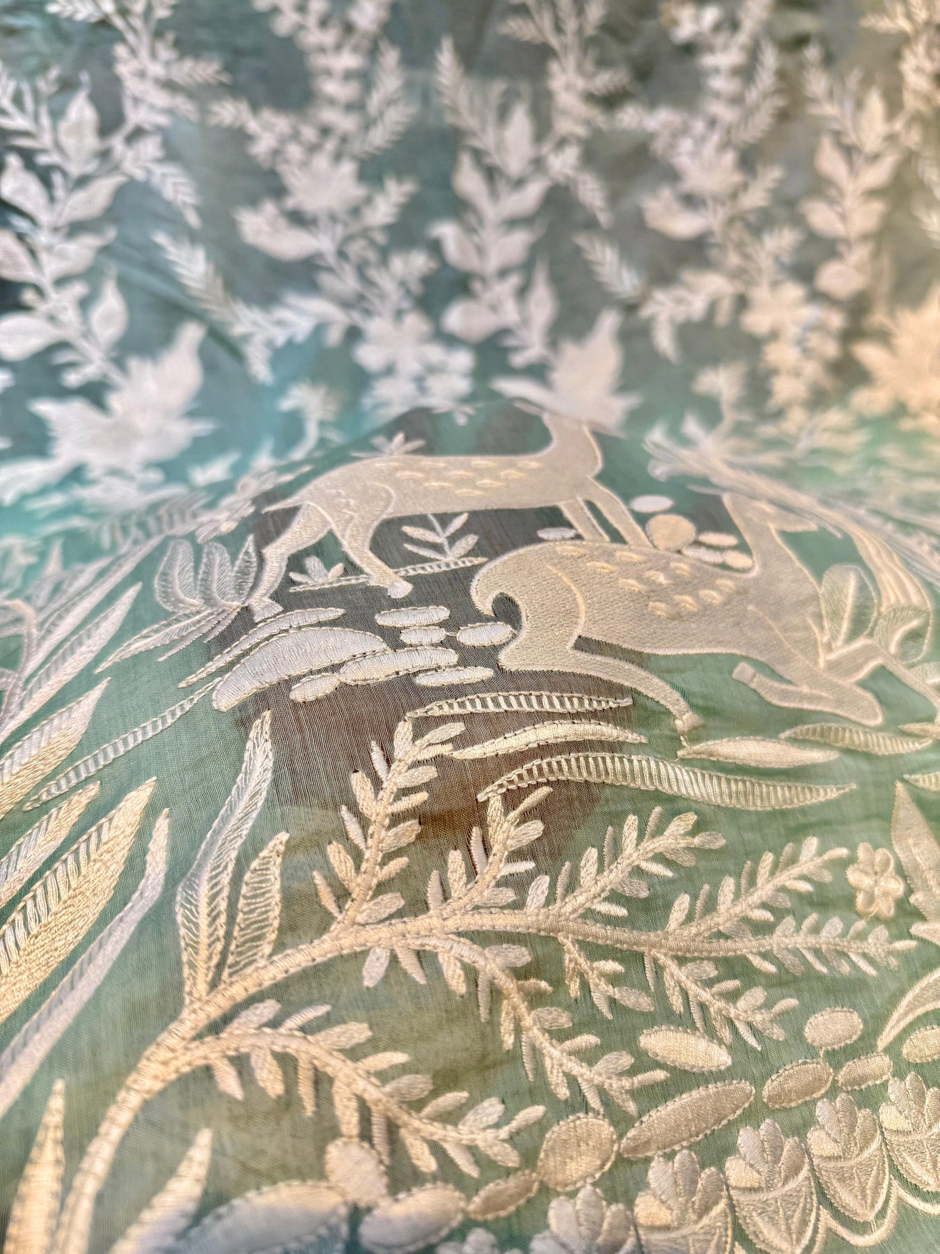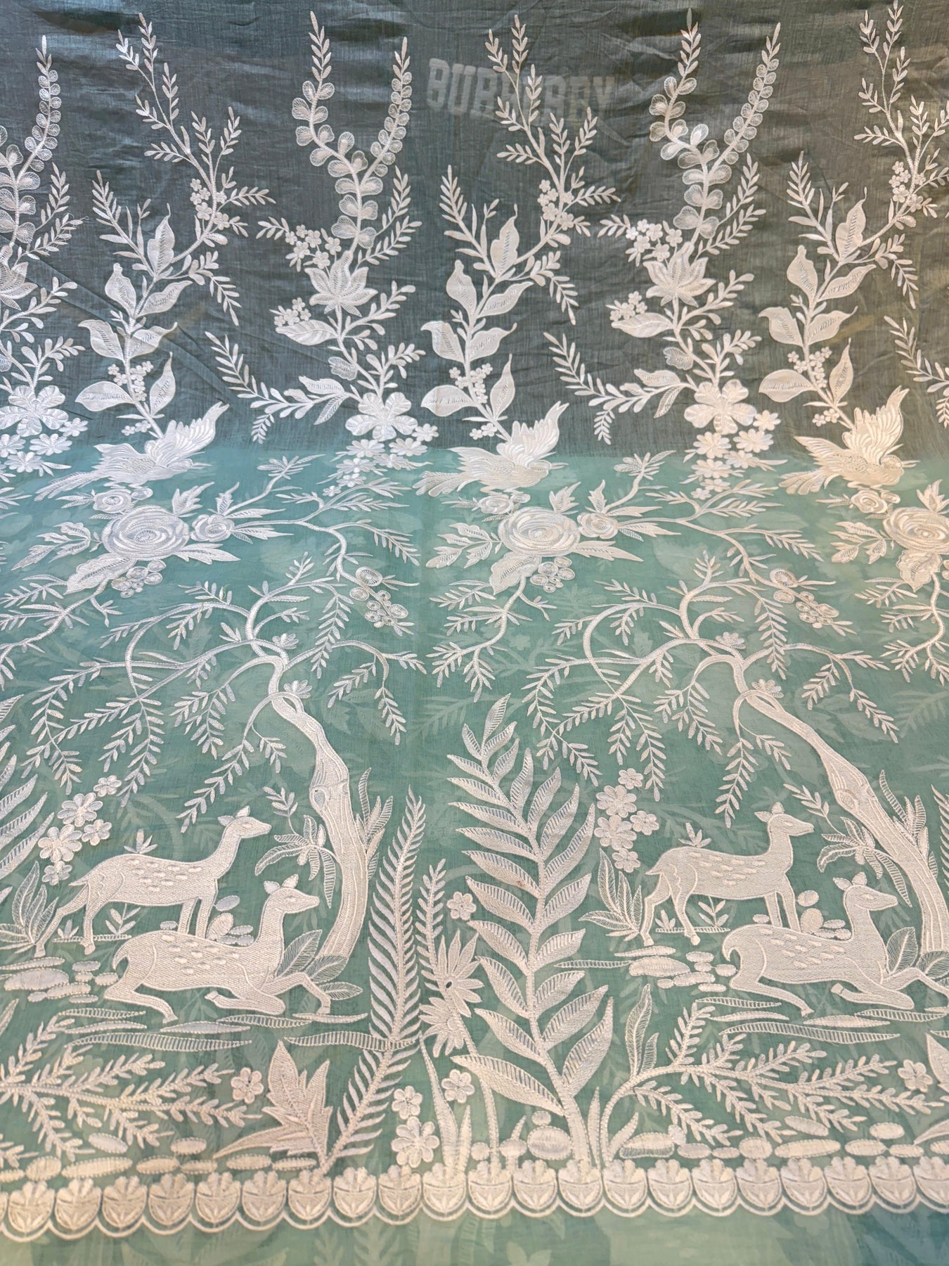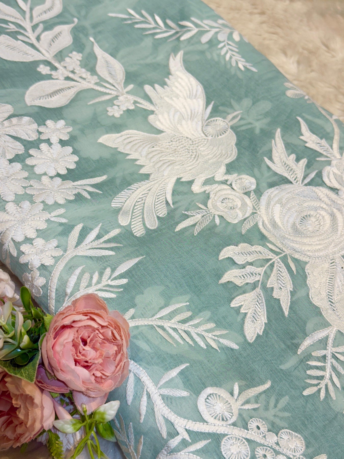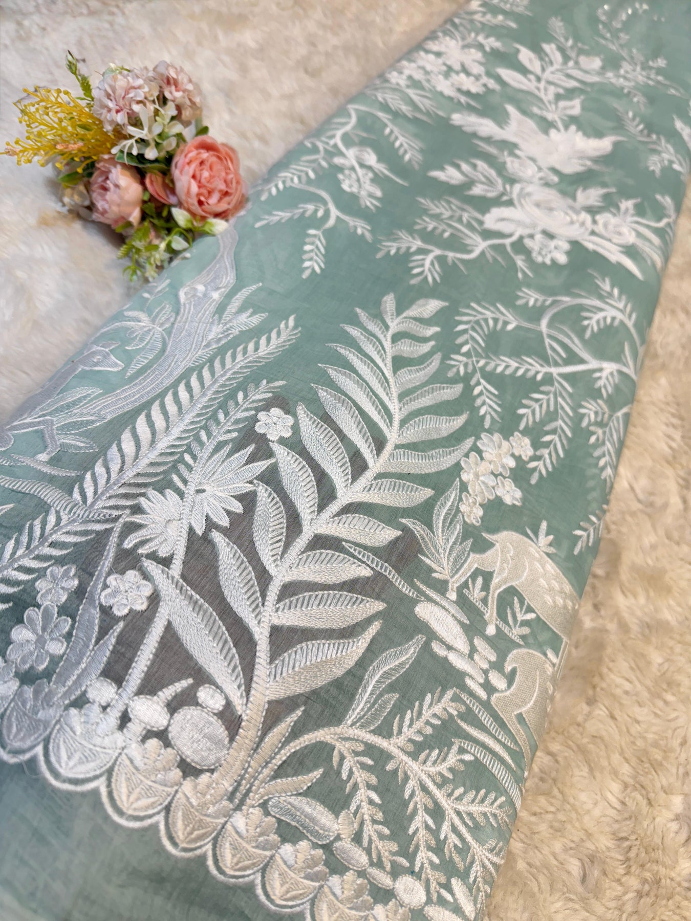 Aqua Blue Pure Mul Chanderi Embroidery With ThreadWork Shikargarh 50 inch width