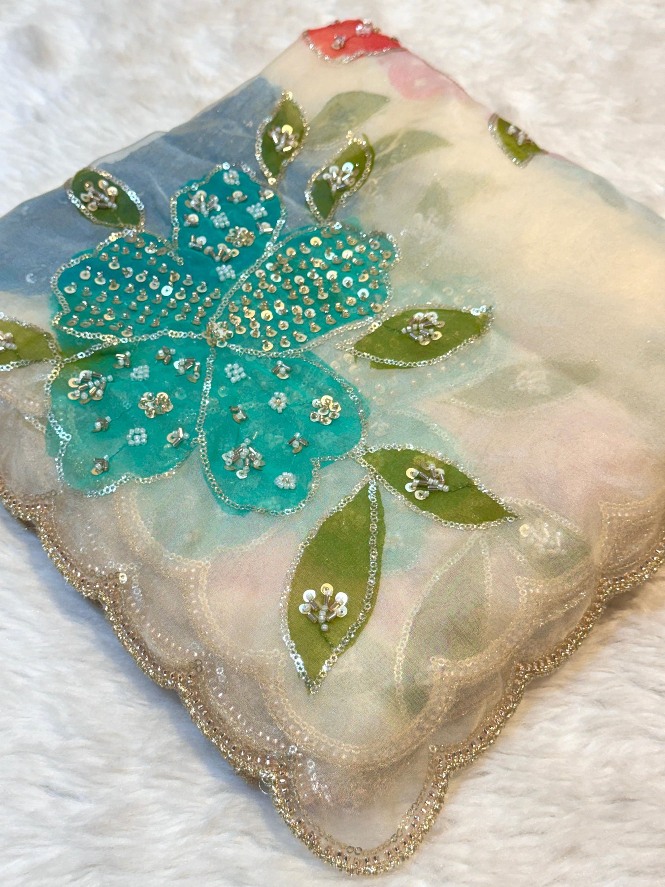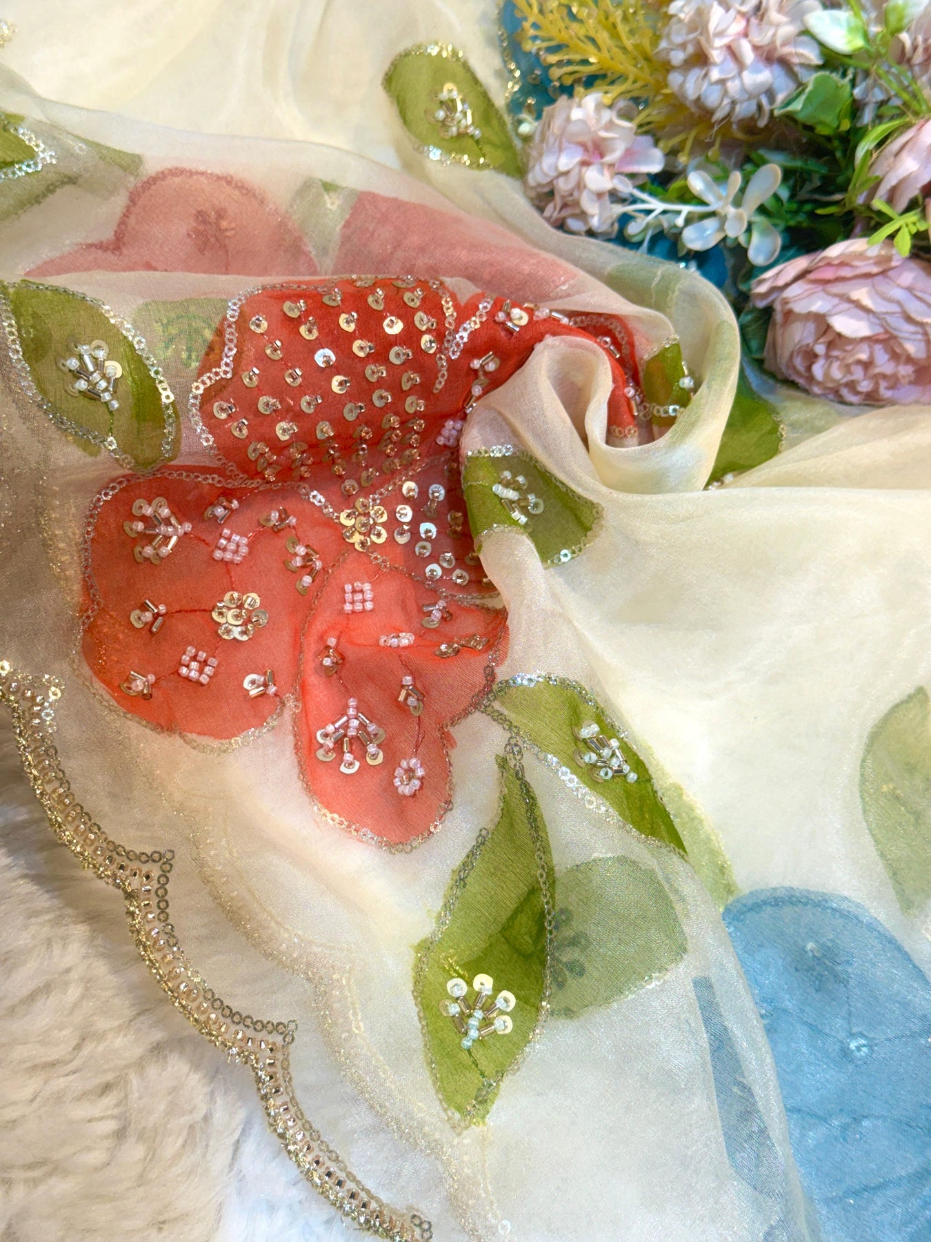 Ayesha Beige Pure Organza Handwork Dupatta With Floral Work and Four Side Scalloped Borders 2.40 meter length