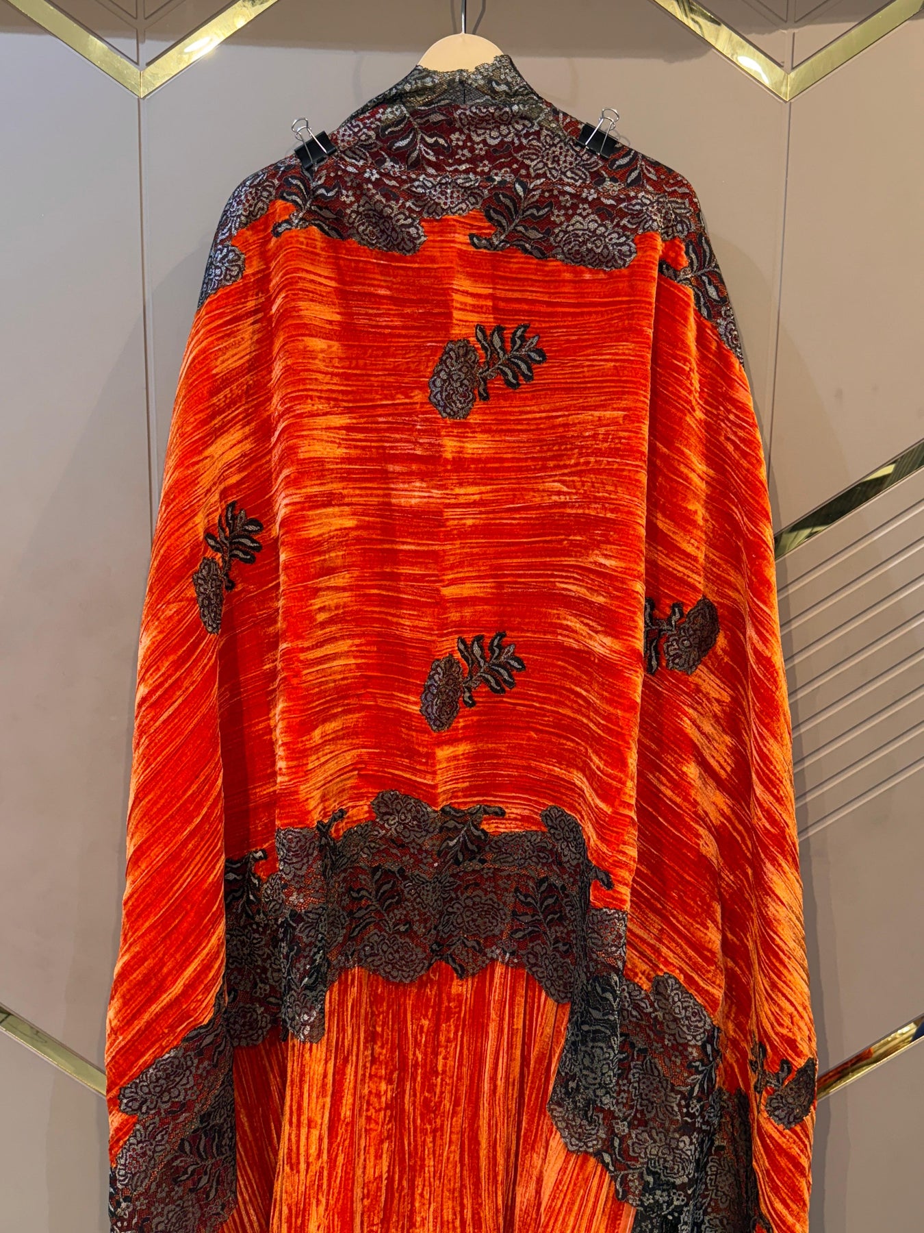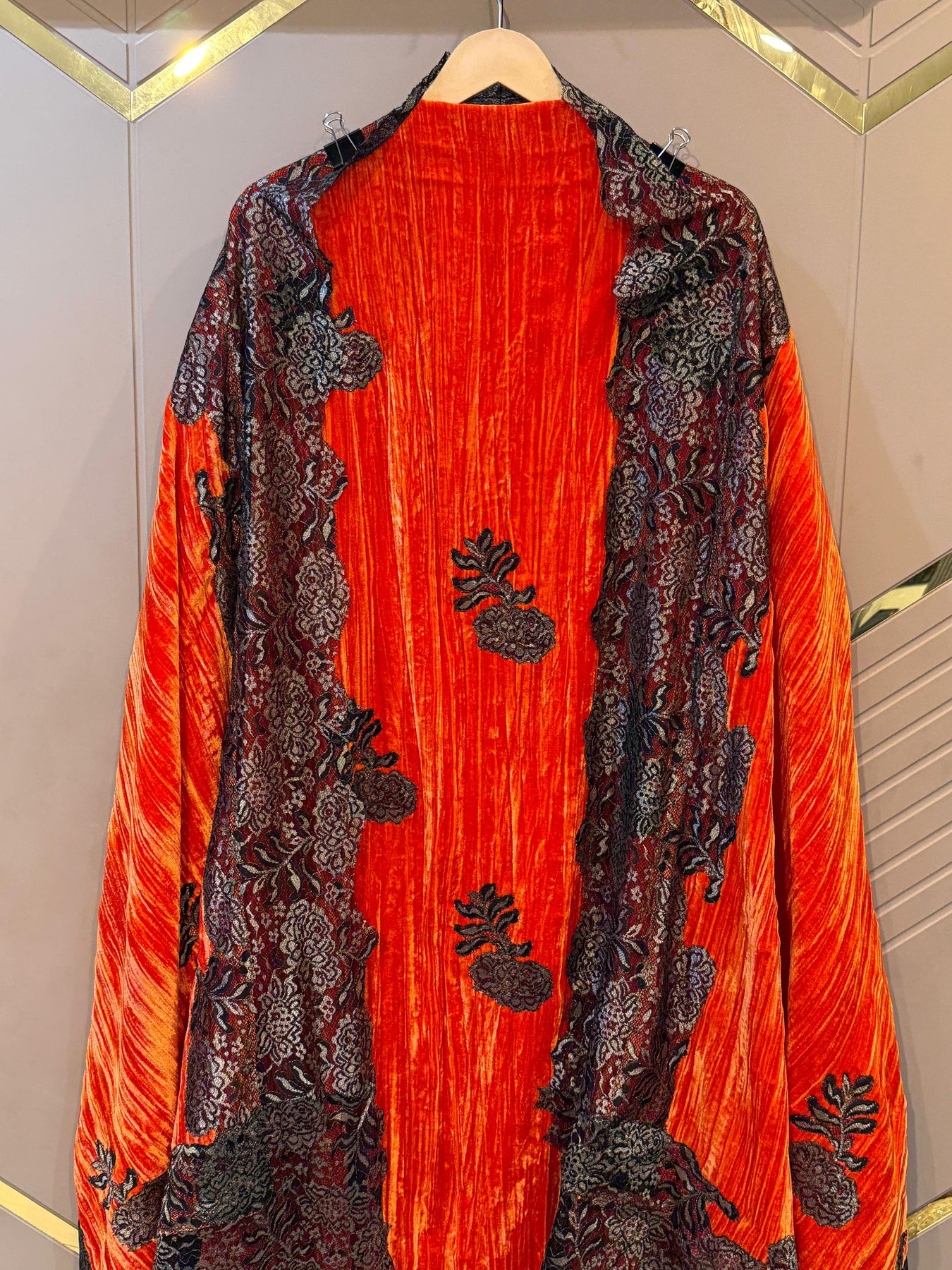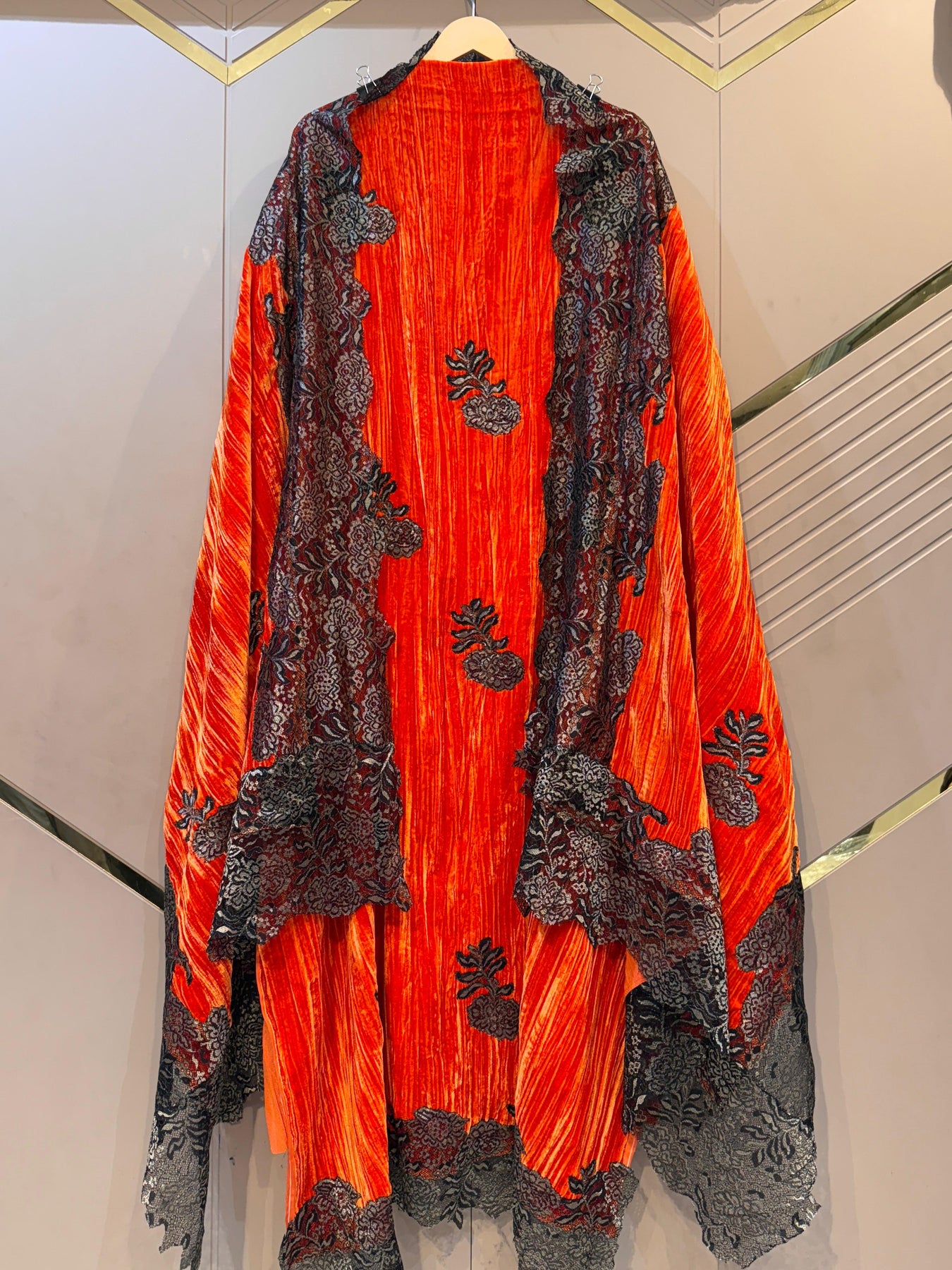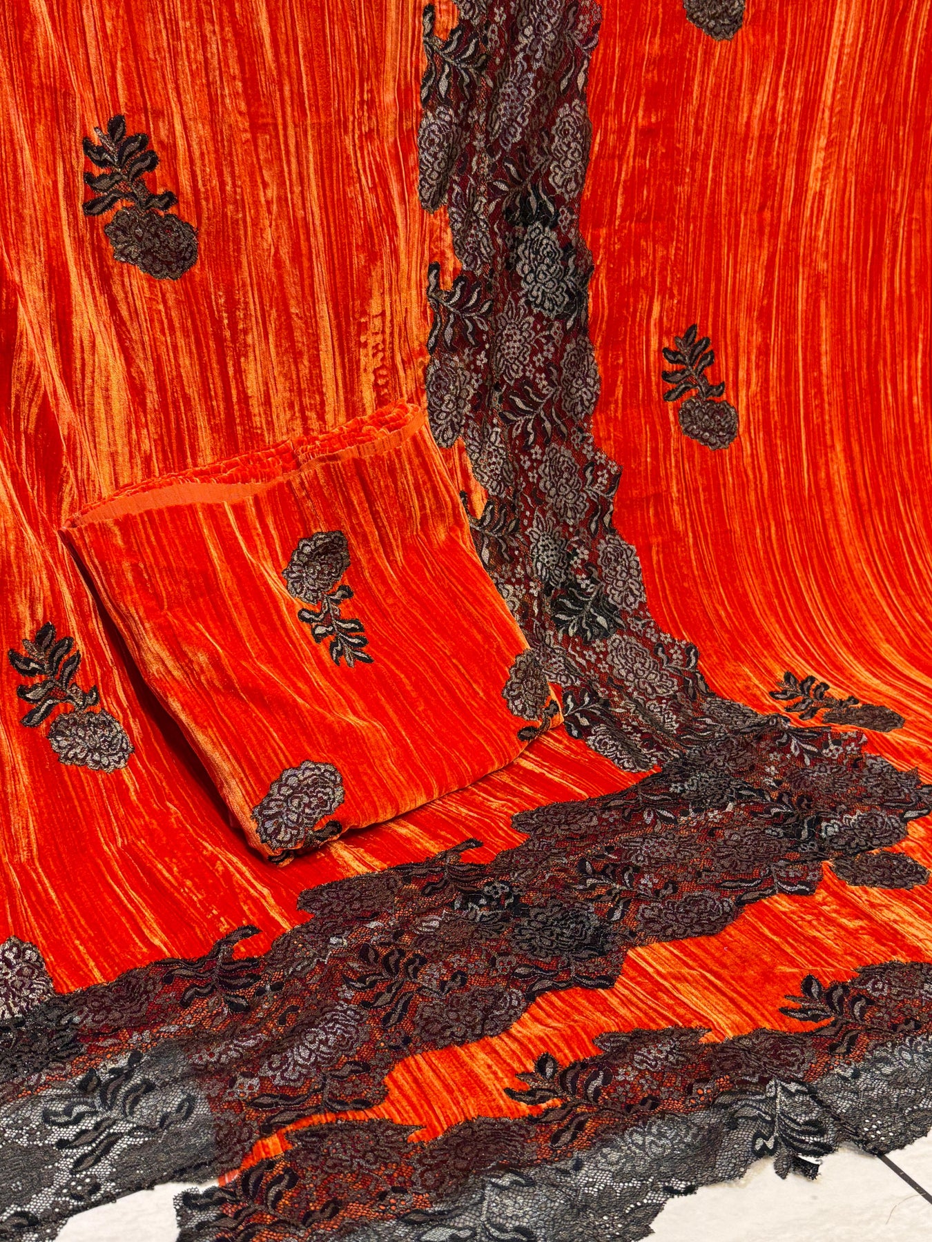 Orange Pure Crush Velvet Suit Sets With Lace Appliqué Patch work