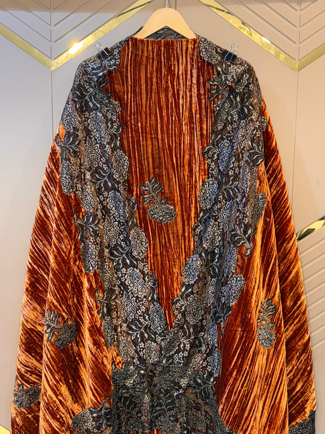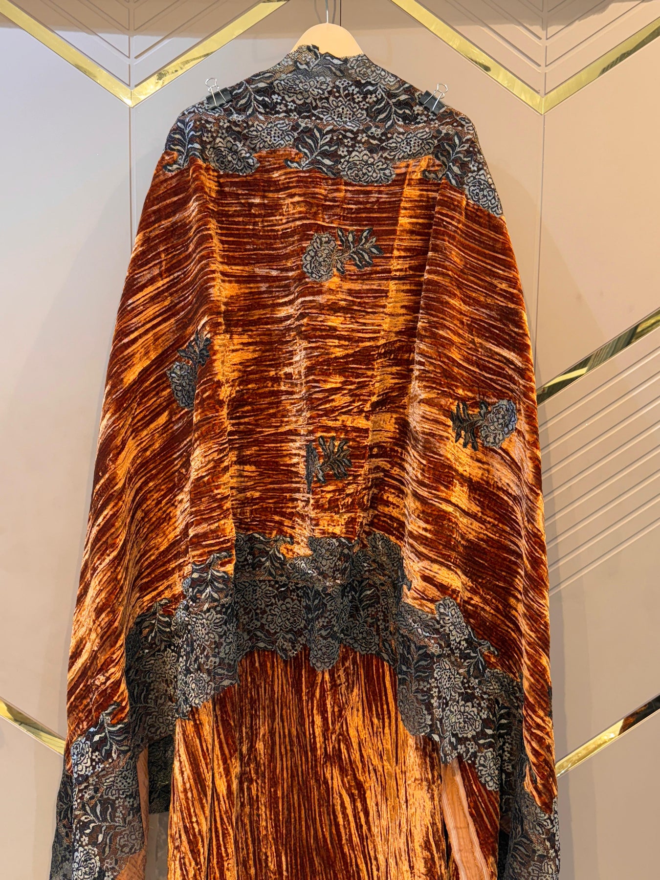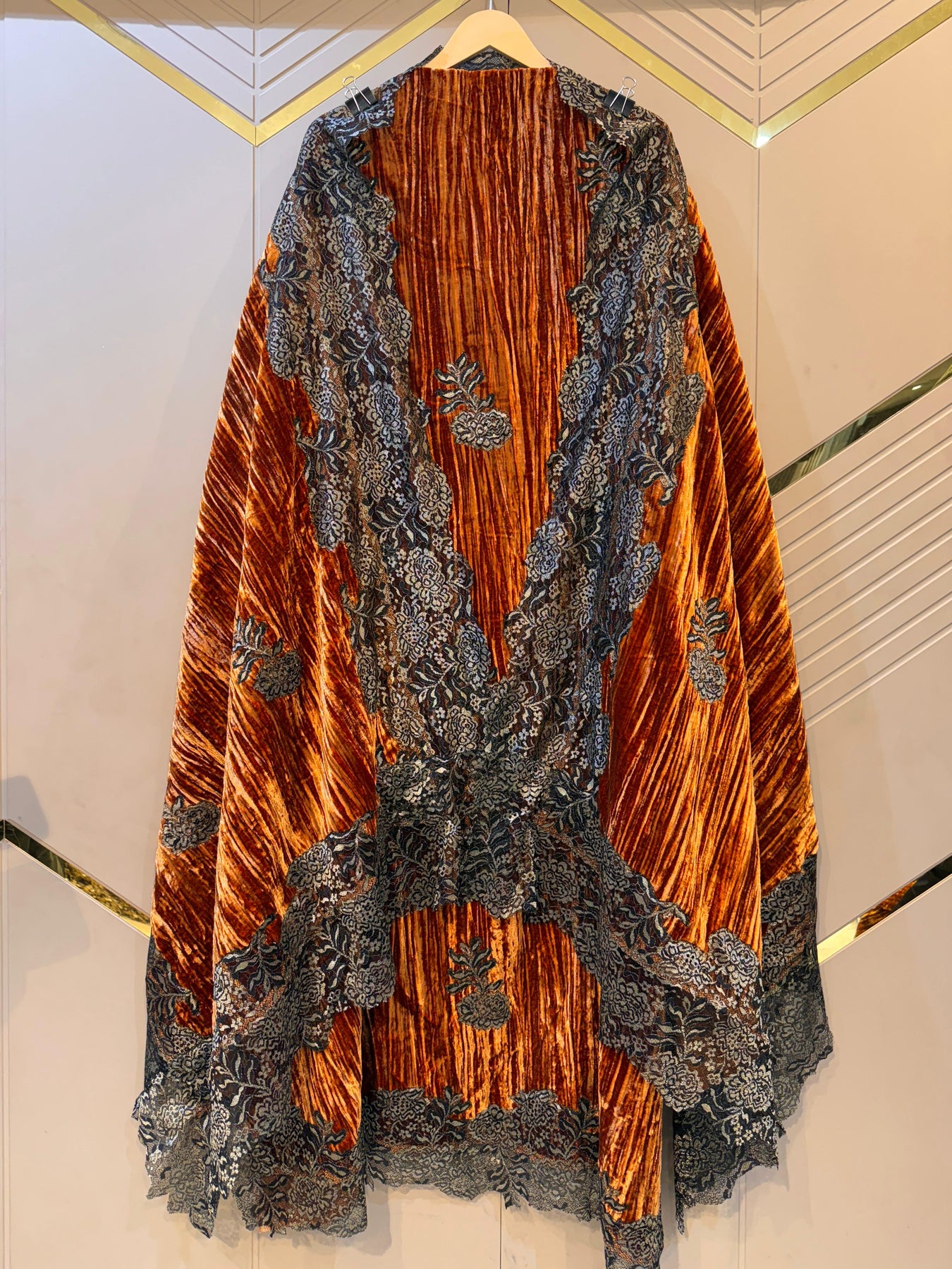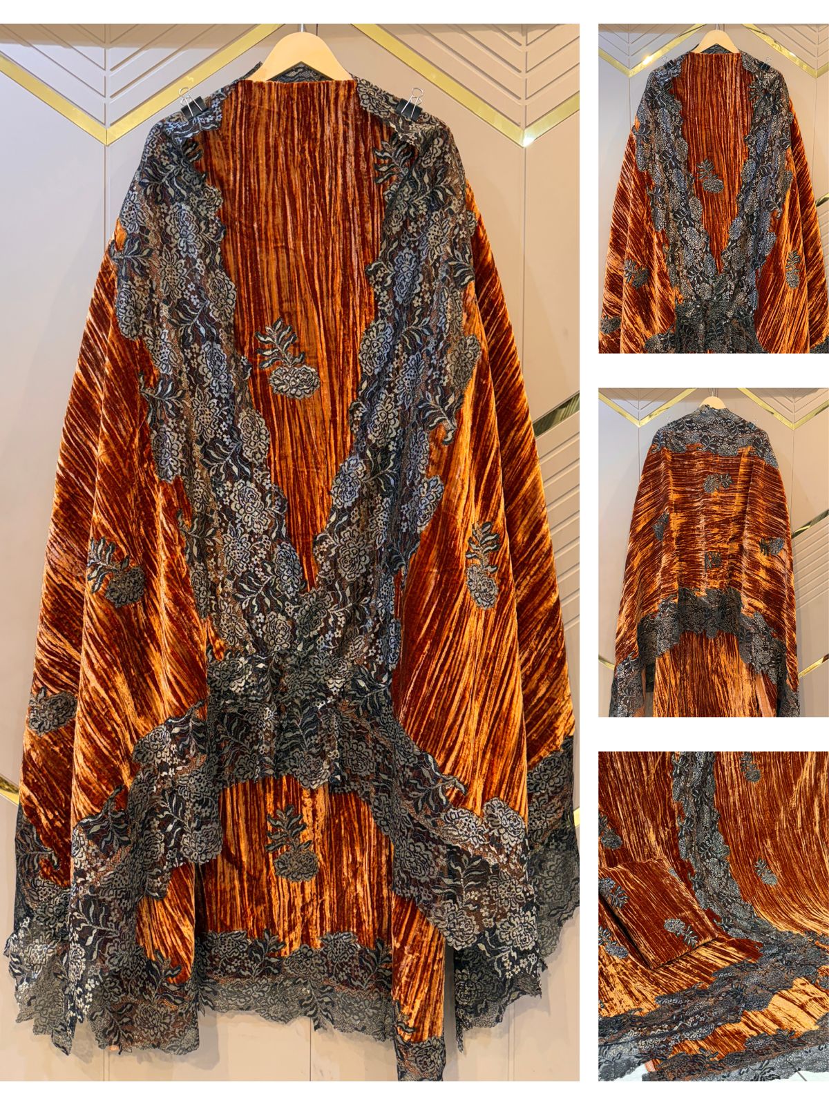 Elevate your tailoring projects with this exquisite Pure Crush velvet fabric, expertly crafted for discerning designers and seamstresses. The luxurious velvet base provides a sumptuous drape and rich texture, while intricate lace appliqué patchwork detailing adds sophisticated visual interest and dimensional appeal. Perfectly suited for constructing refined suits with structured silhouettes or flowing straight kaftans that command attention. The combination of premium velvet and delicate lace work ensures your creations showcase both elegance and craftsmanship. Ideal for festive occasions, formal wear, and statement pieces that reflect impeccable taste and attention to detail.