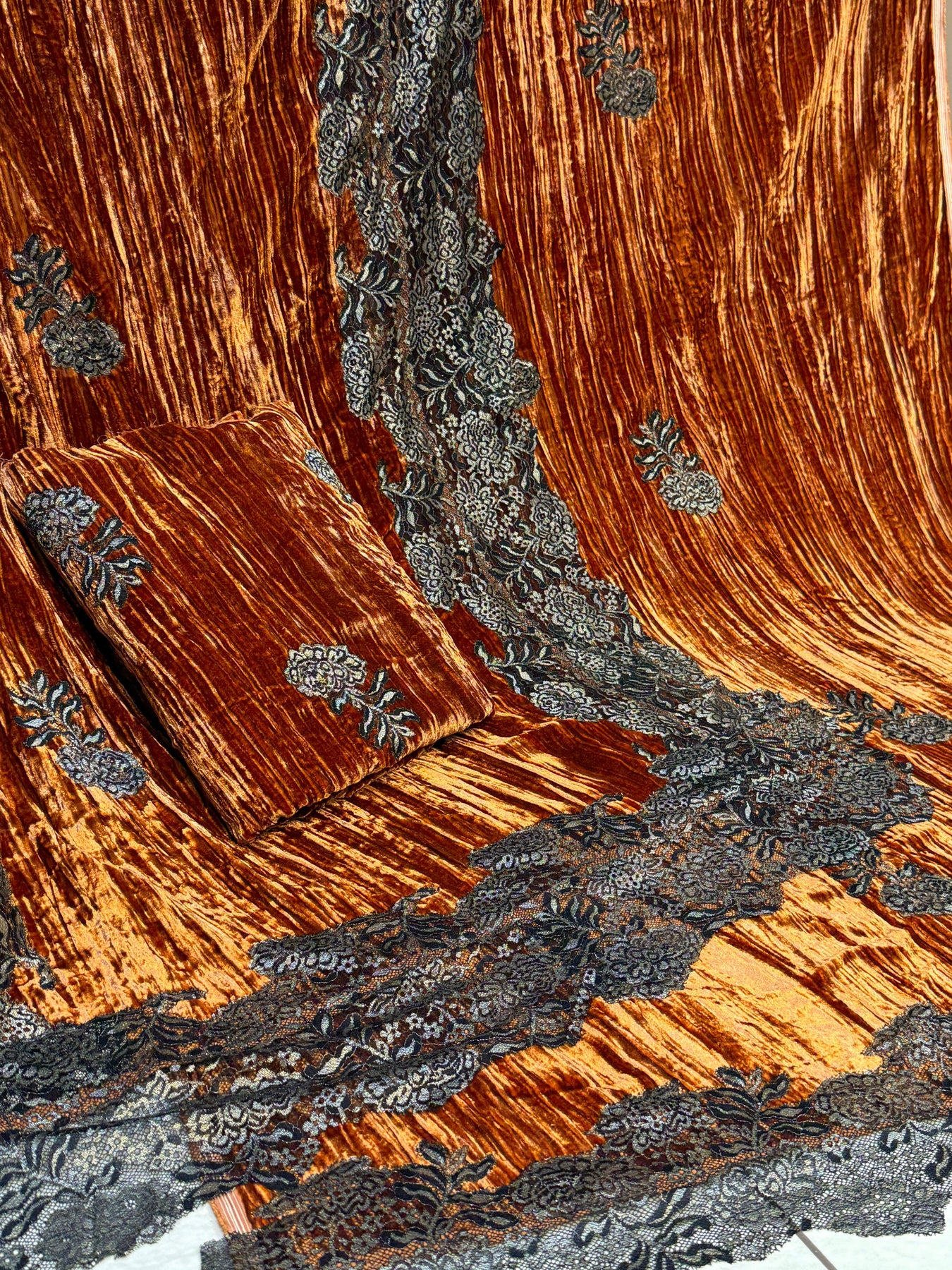 Rust Orange Pure Crush Velvet Suit Sets With Lace Appliqué Patch work