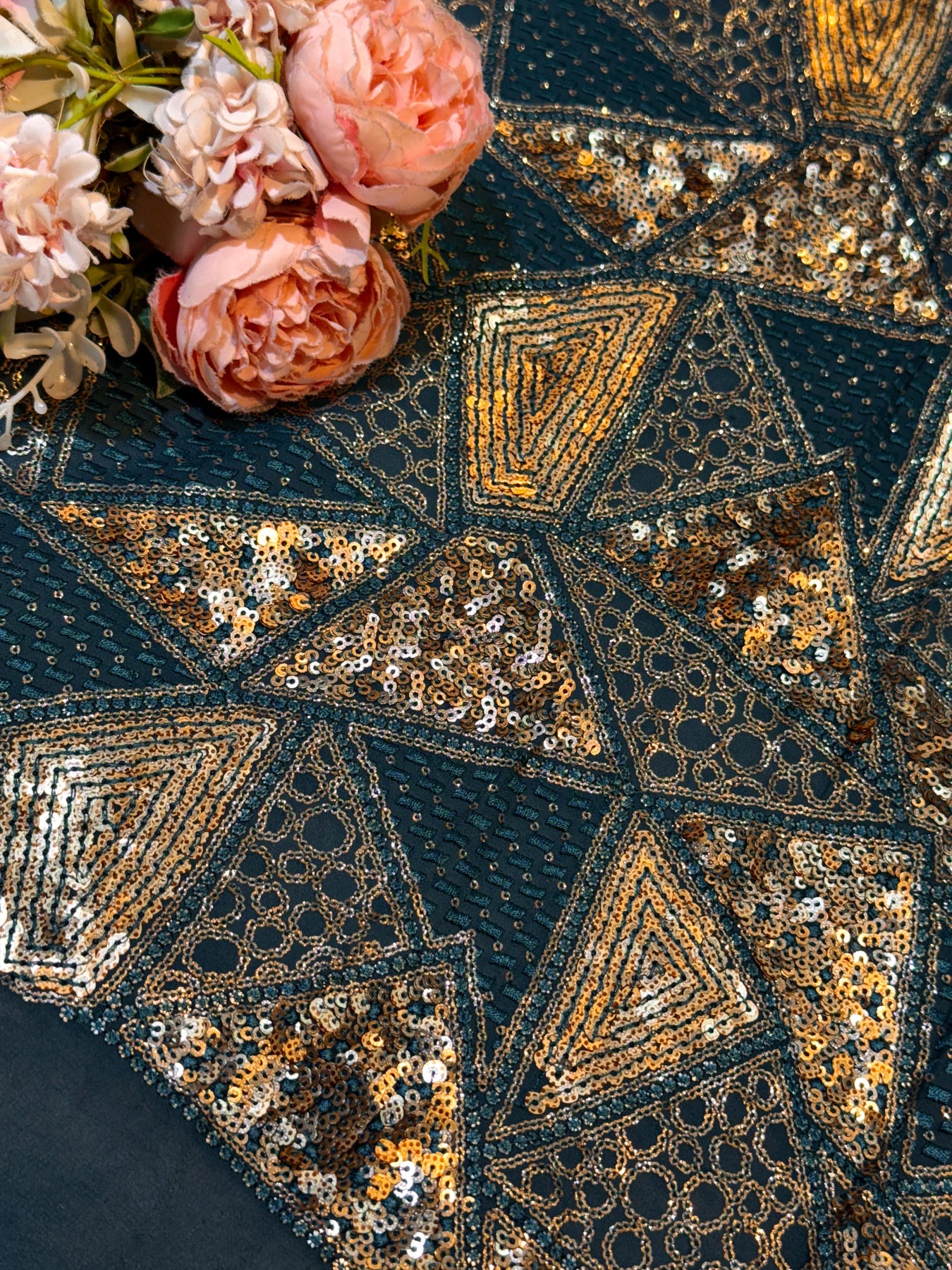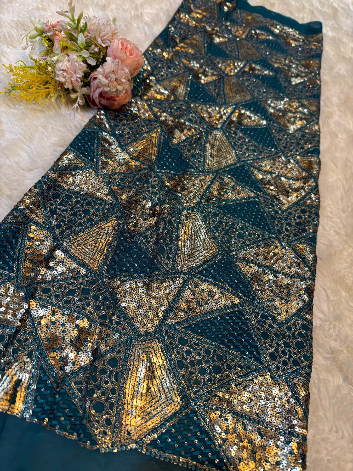 (Precut of 0.5 Meter) Teal Blue Georgette Thread And Sequins Embroidery Prism Pattern 44 inch width