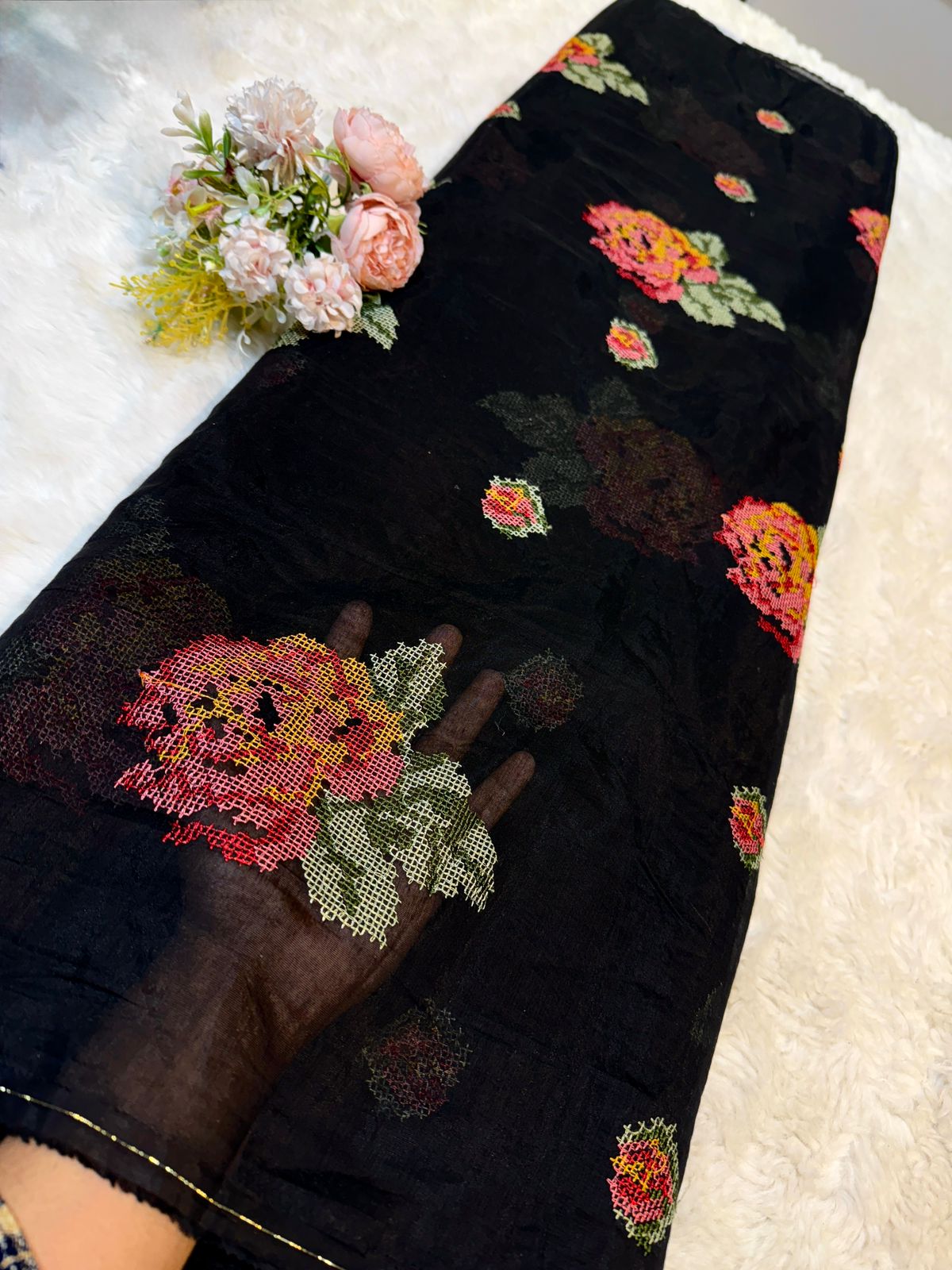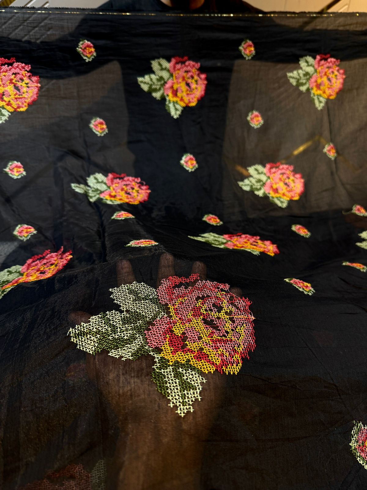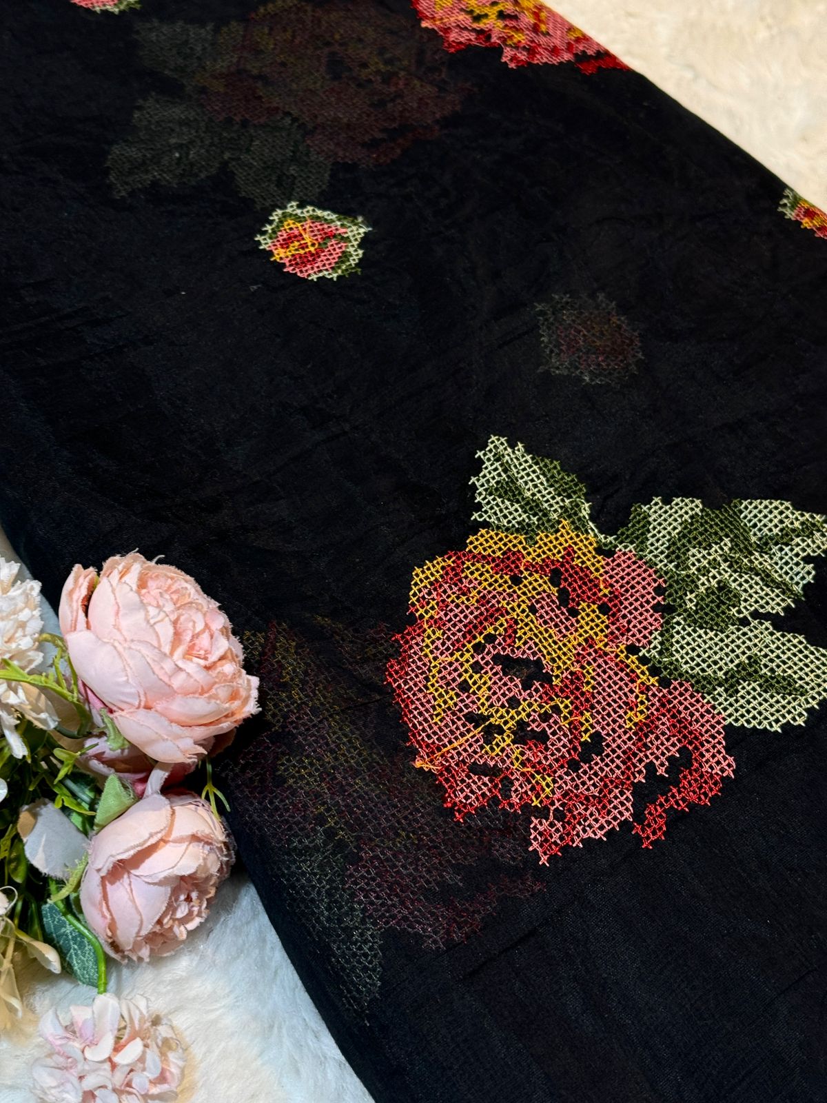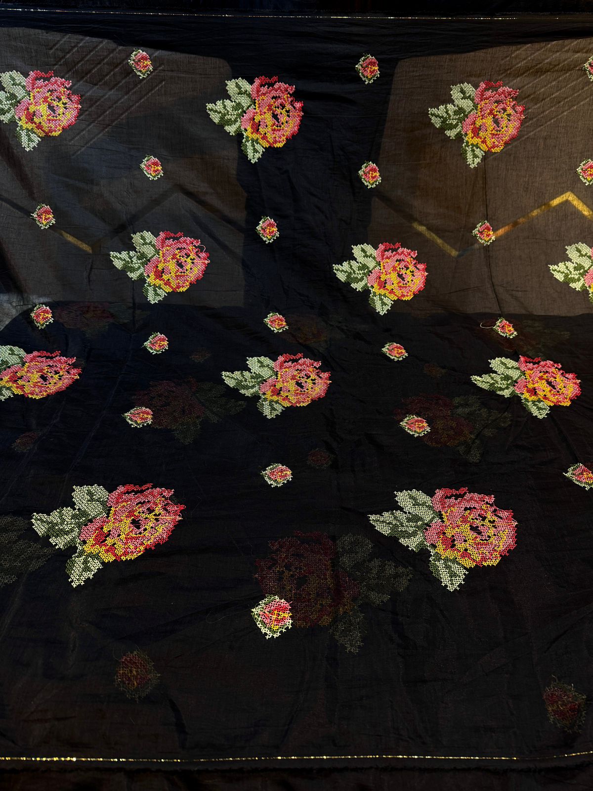 Black Pure Mul Chanderi Embroidery Tatami Stich Work 44 inch width
