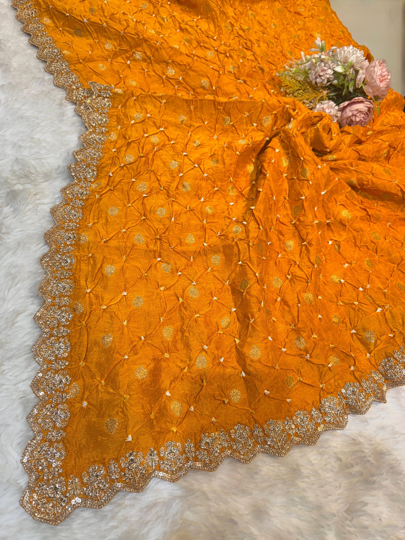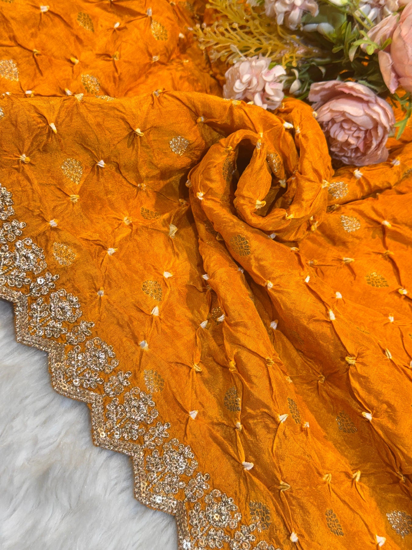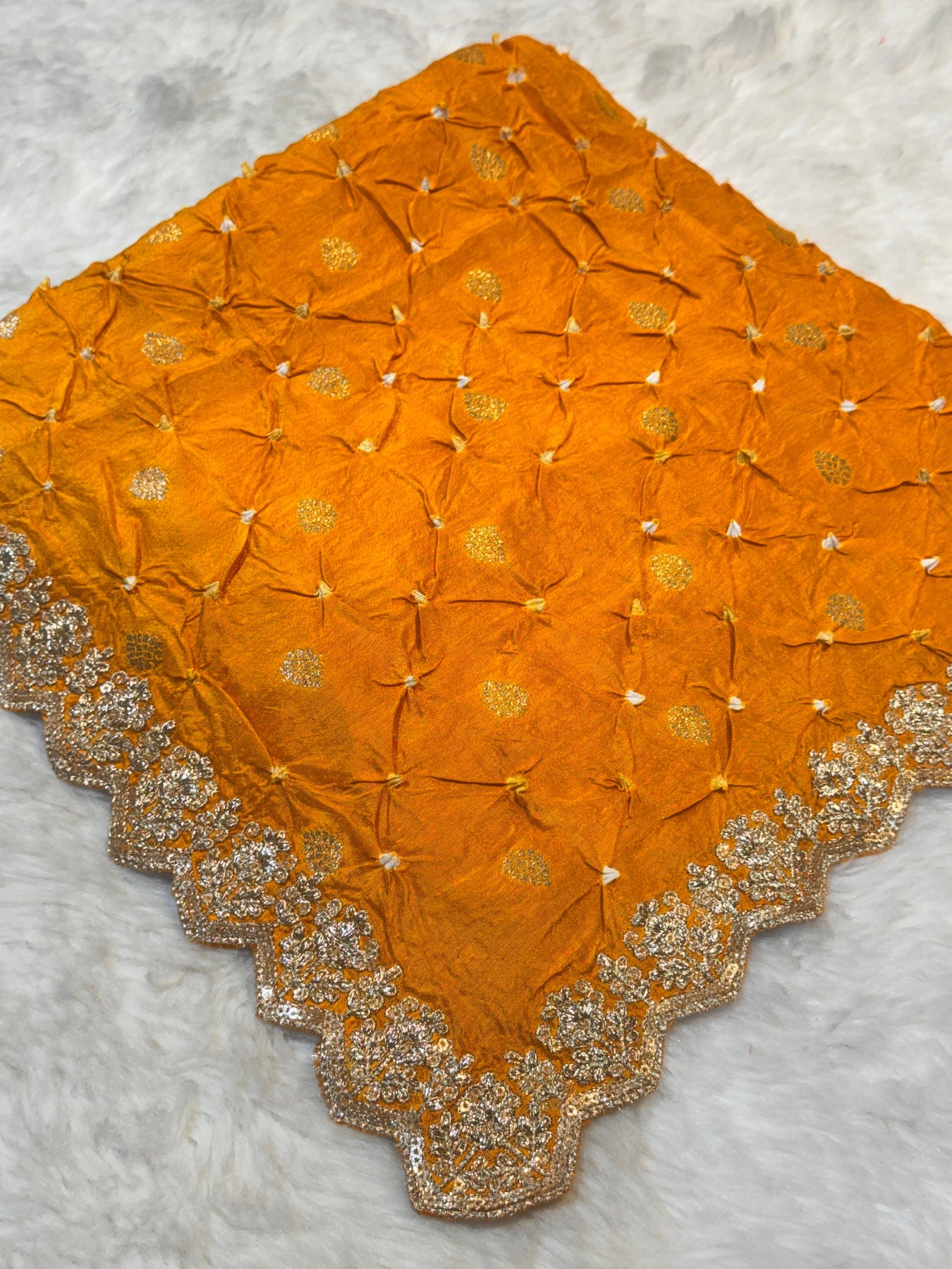 Elevate your ethnic ensemble with this exquisite Falak dupatta, crafted from pure munga silk in a rich dark mustard hue. Each piece showcases authentic hand bandhej work—a traditional tie-and-dye technique that creates distinctive patterns—complemented by intricate Banarsi booti embellishments and delicate cutwork borders. The combination of these time-honored craftsmanship methods results in a versatile accessory that seamlessly complements dresses, gowns, lehengas, and suits. Perfect for weddings, festivals, or special occasions, this dupatta brings timeless elegance and cultural sophistication to any outfit.