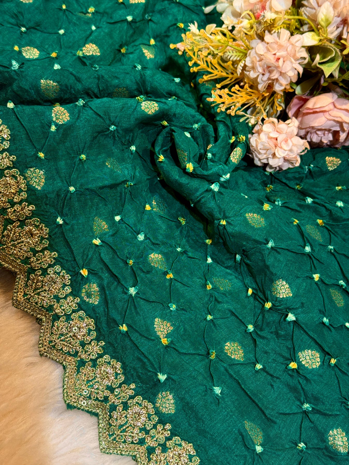Falak Peacock Green munga Silk Original Hand bandhej dupatta with Banarsi booti and Cutwork borders
