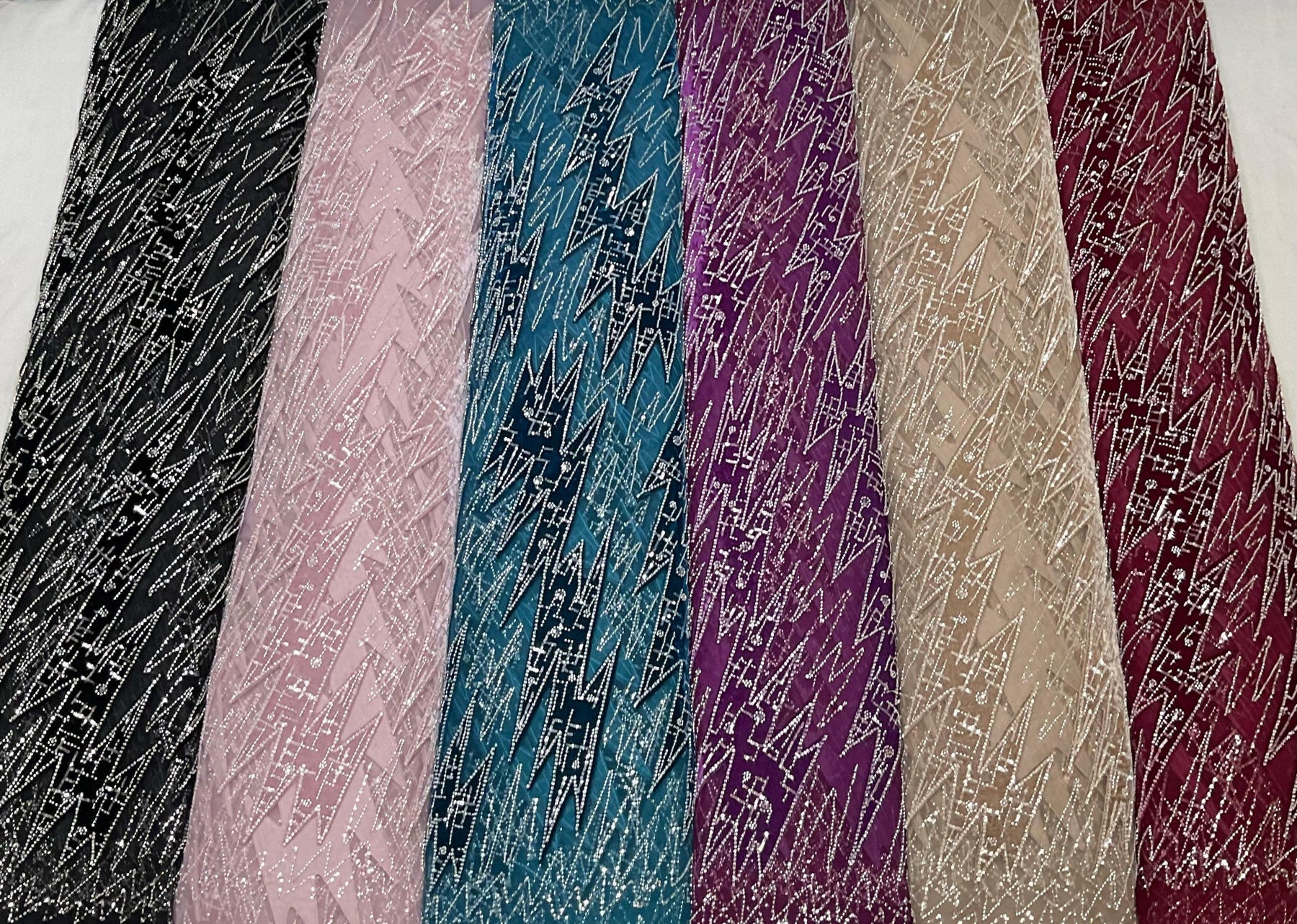 Elevate your couture creations with this exquisite imported net fabric, meticulously embellished with velvet appliqué work. Measuring 54 inches in width, this premium textile combines delicate net with luxurious velvet detailing, creating stunning visual depth and texture. Perfect for crafting elegant dresses, flowing gowns, and traditional lehengas, this fabric delivers the sophistication and craftsmanship your designs demand. The handwork quality ensures each piece is distinctive, making it an ideal choice for special occasions and high-end garment construction. |