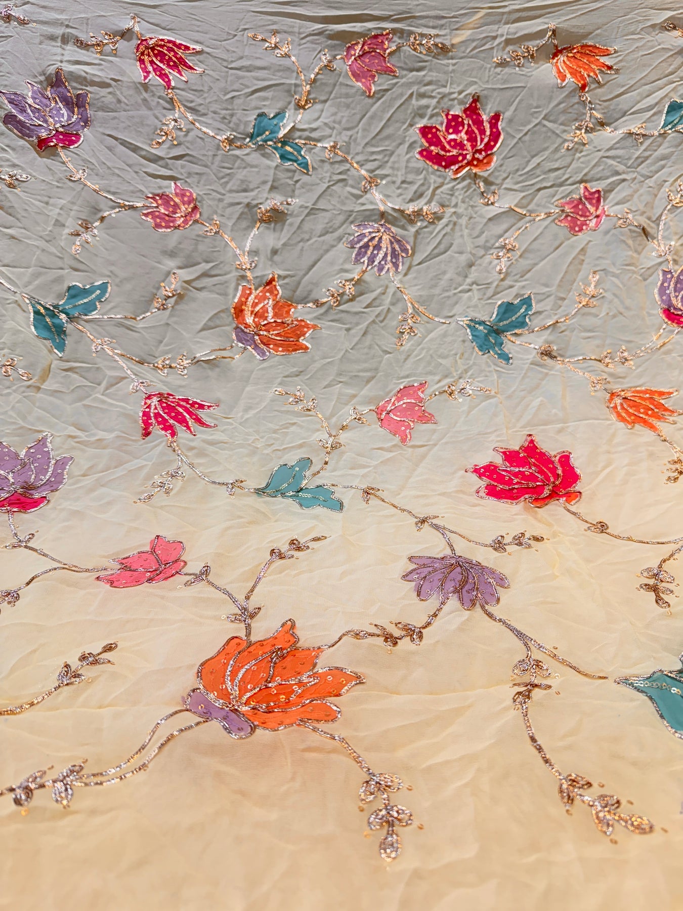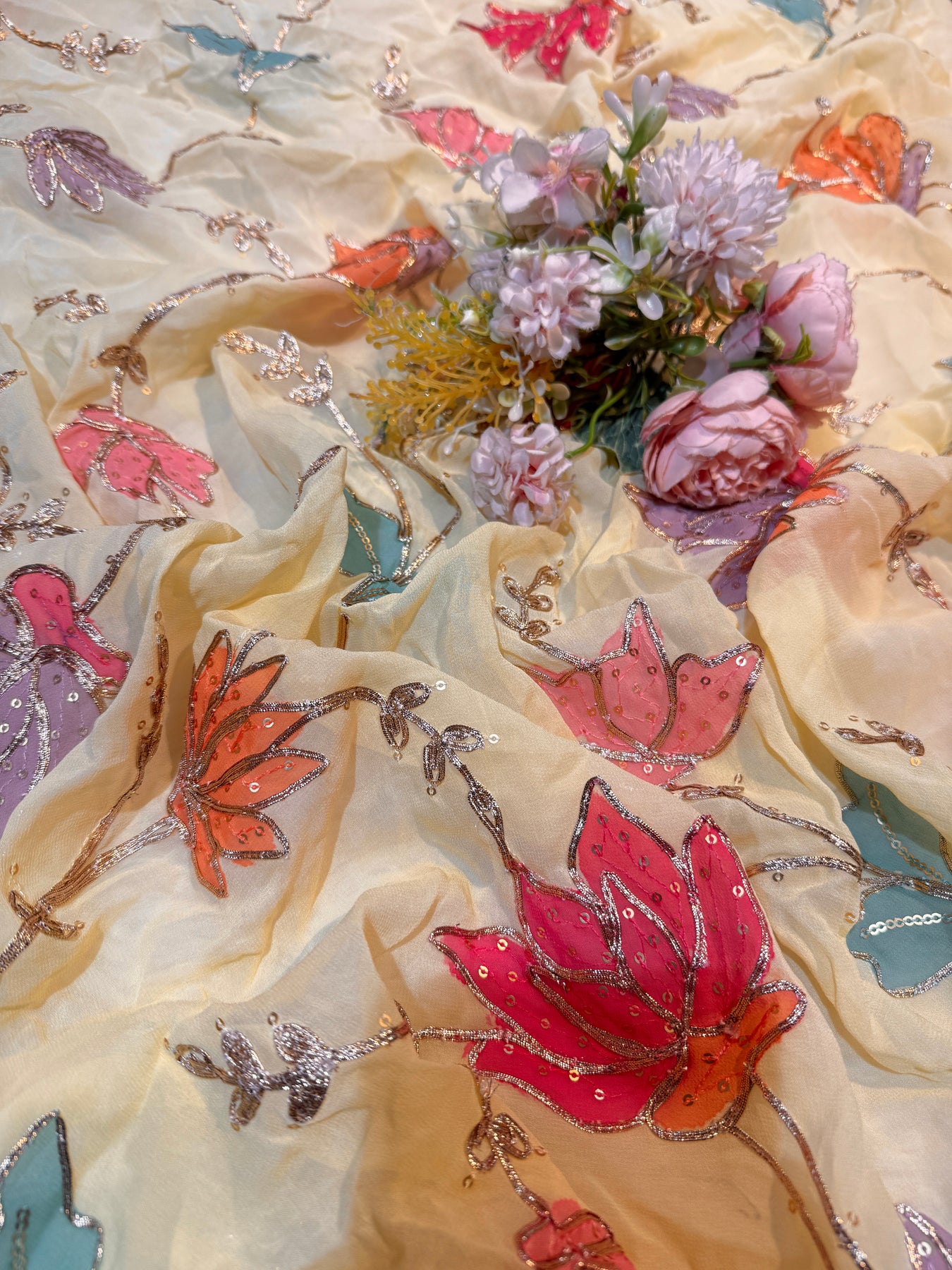 (Precut of 1 Meter) Lemon Yellow Georgette Embroidery With Sequins , Thread And Zari Work 44 Inch