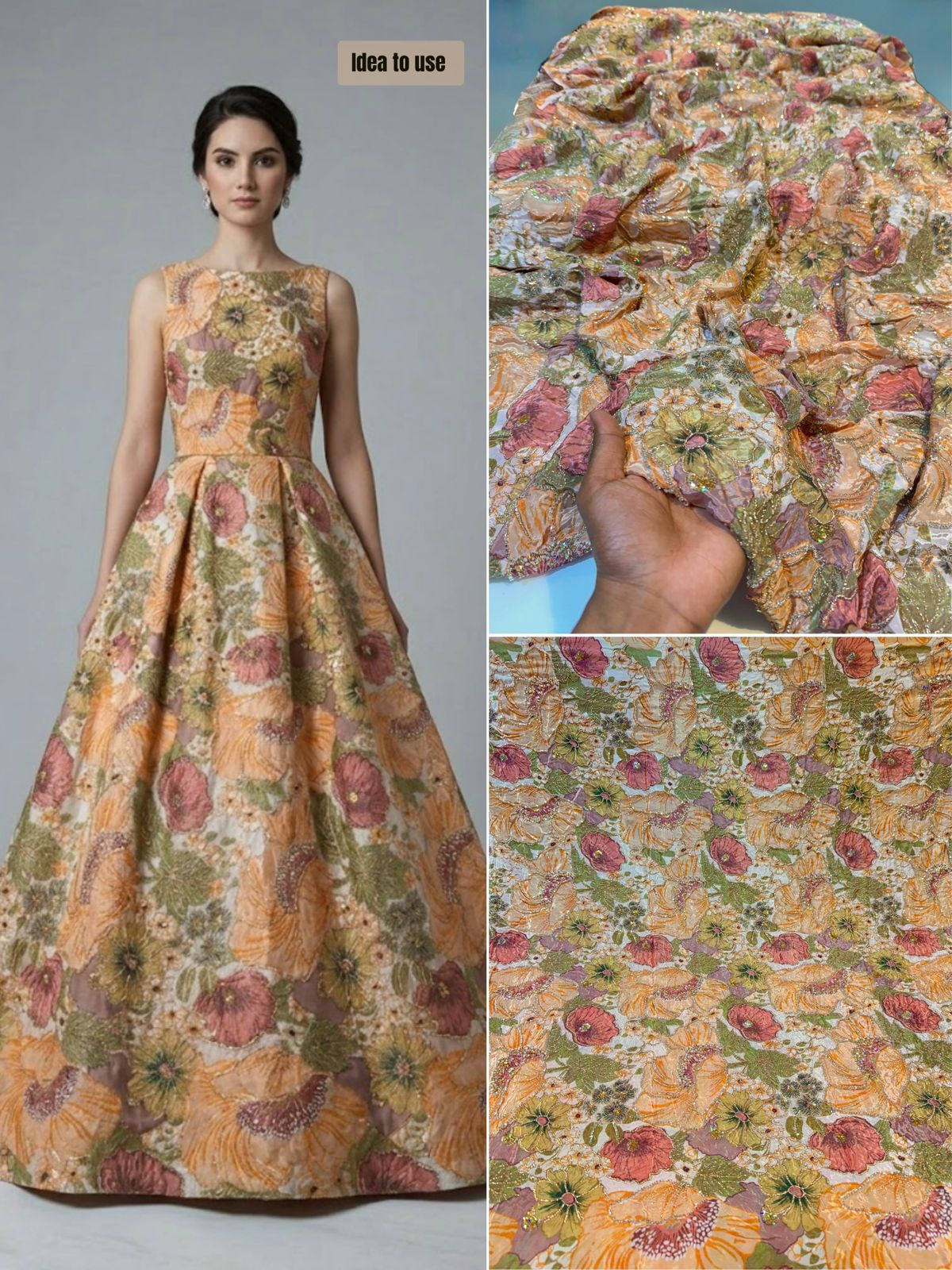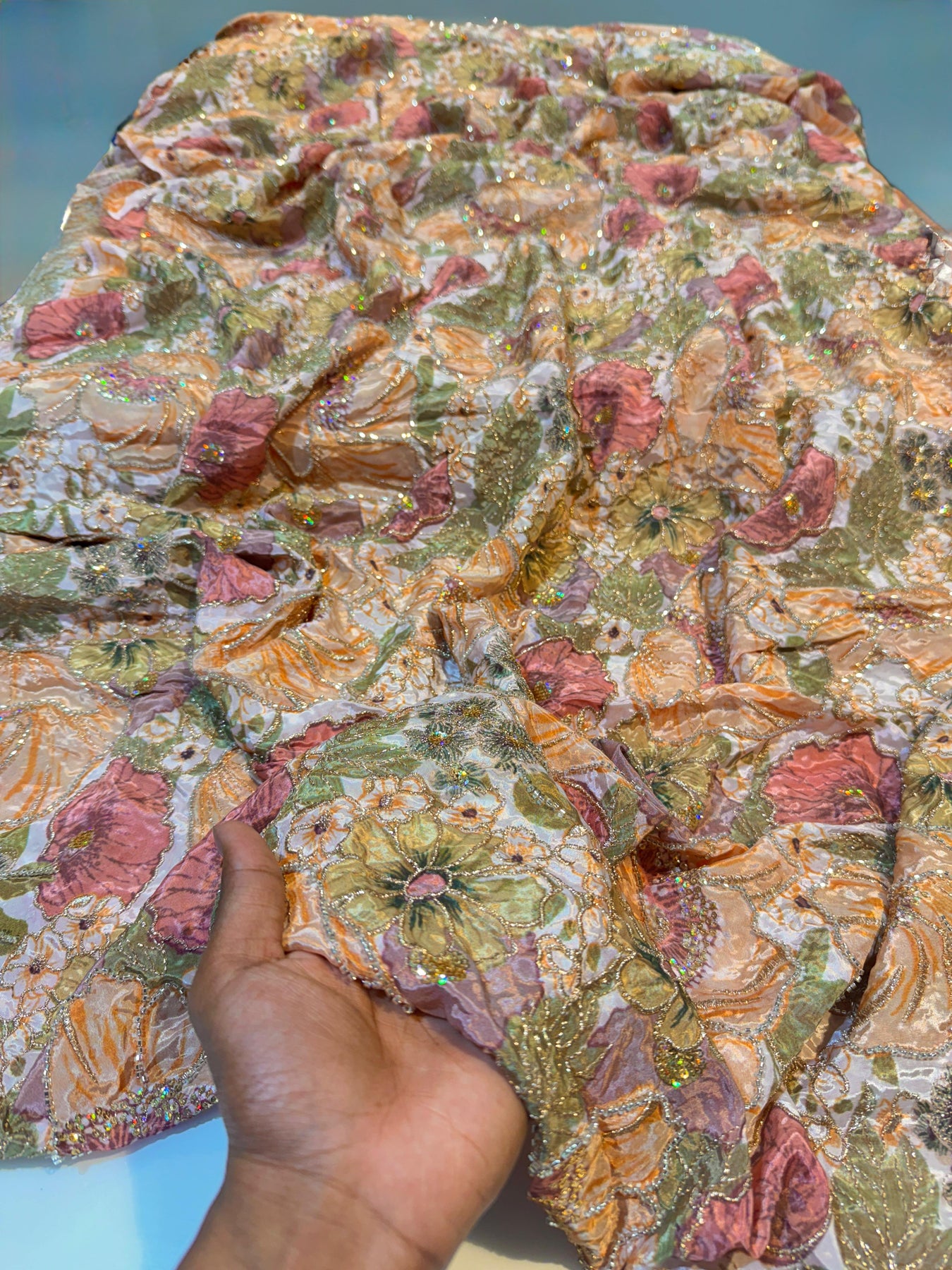 Elevate your creations with this exquisite Luxury Crape fabric, featuring intricate floral prints enhanced by delicate handwork embroidery. Measuring 44 inches wide, this premium material combines the soft, textured appeal of crape with artistic embellishments that showcase traditional craftsmanship. Ideal for designing elegant sarees, tailored suits, and flowing gowns, this fabric offers versatility for both festive occasions and refined everyday wear. The detailed floral embroidery adds depth and visual interest, while the crape base ensures comfortable draping and movement. Perfect for those seeking sophisticated, artisan-quality fabrics that make a statement with every stitch. |