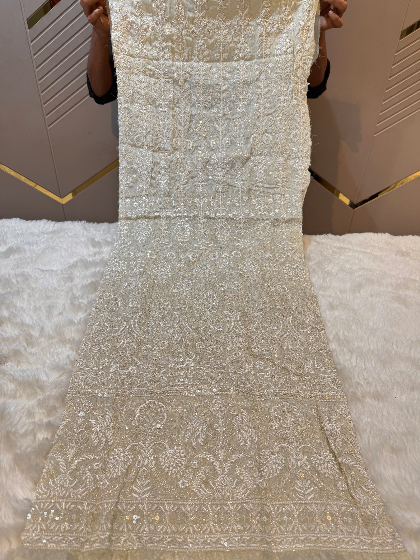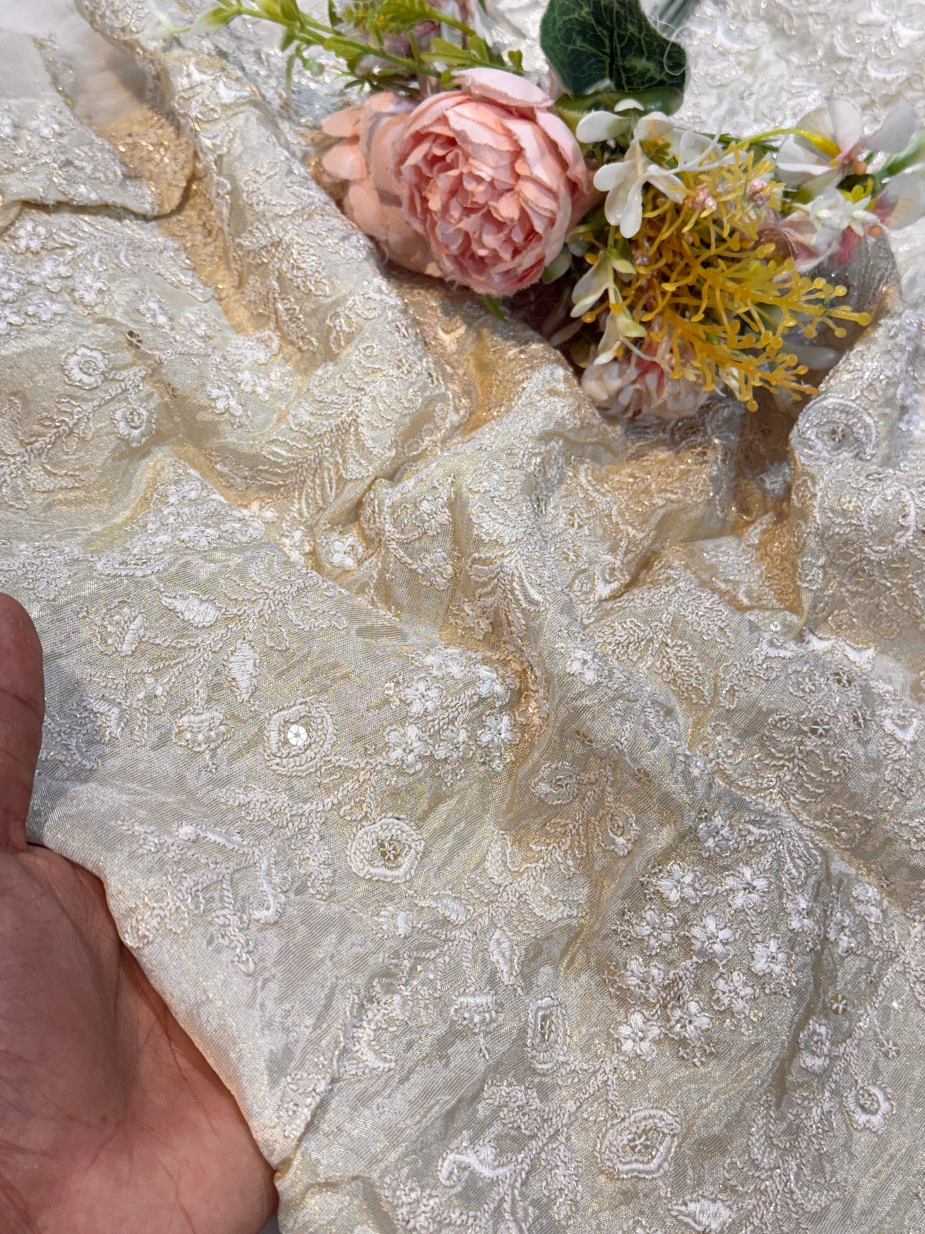 Pure Zari Tissue Handwork Embroidery with Sequins and Threadwork This exquisite precut fabric measures 0.95 meters at a generous 44-inch width, making it perfectly proportioned for discerning designers and boutique creators. Crafted from premium tissue with authentic zari work, each piece features intricate hand-embroidery complemented by sequin and threadwork detailing. The combination of traditional craftsmanship and luxurious materials creates a fabric of exceptional quality, ideal for creating statement garments, bridal wear, or high-end fashion pieces. The precut length eliminates waste and streamlines your design process, allowing you to focus on bringing your creative vision to life with confidence.