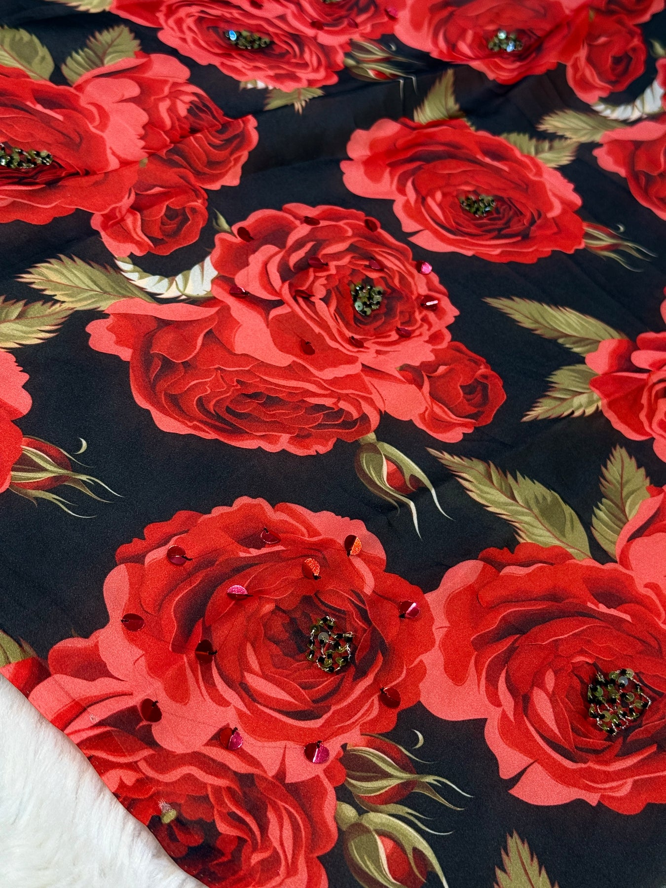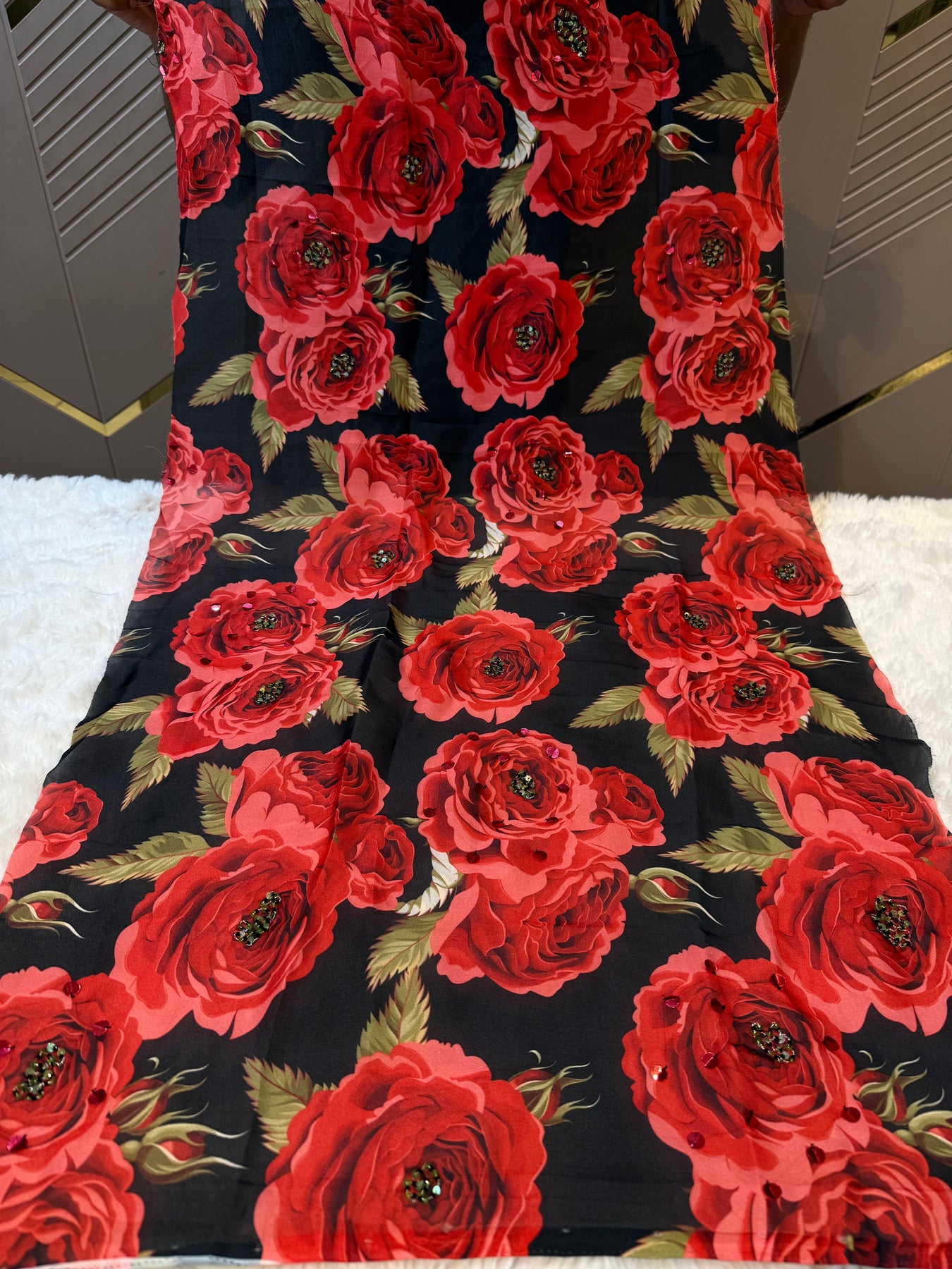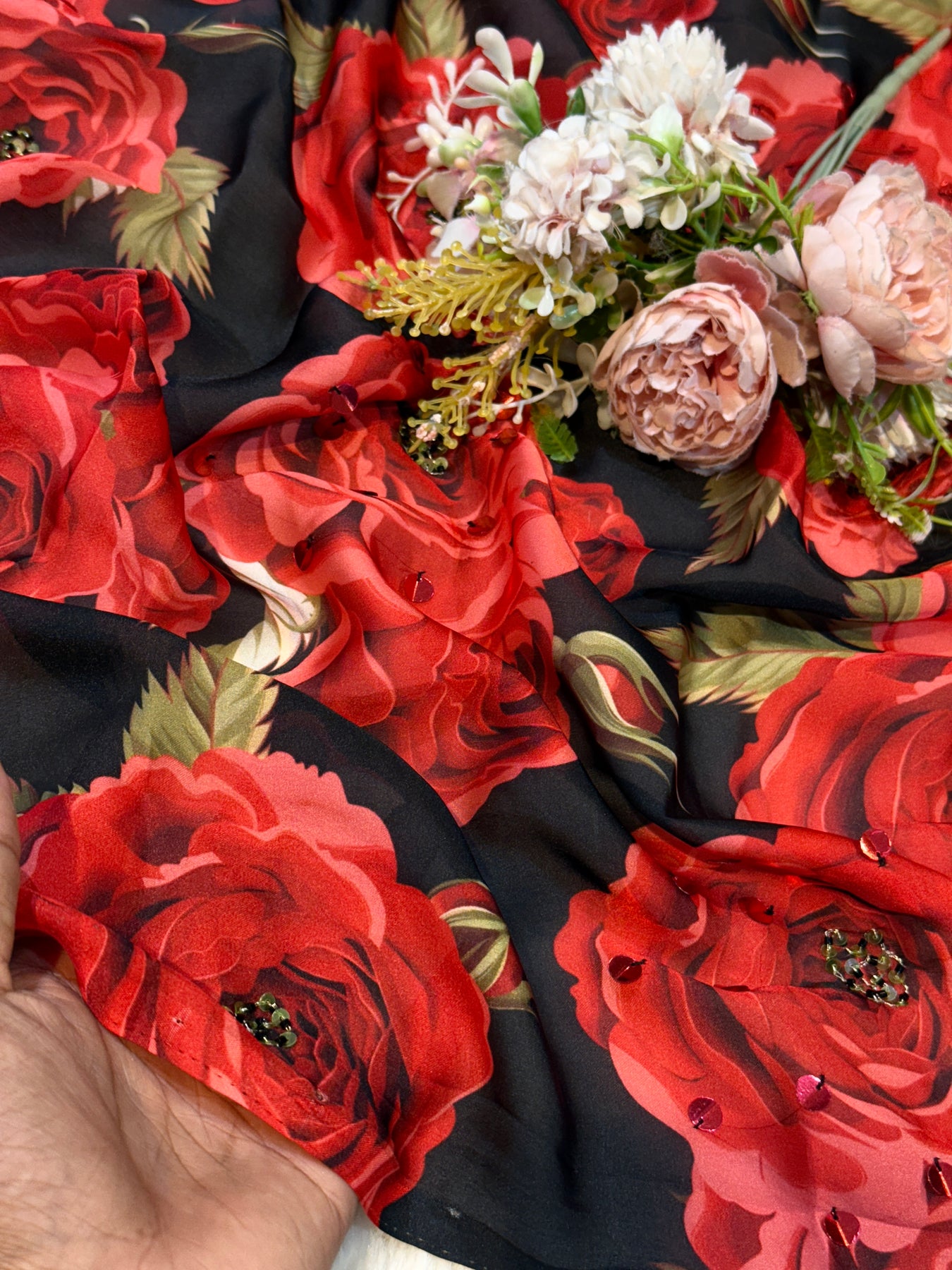 (Precut of 0.5 Meter) Satin Georgette Floral prints with Handwork 44 Inch width