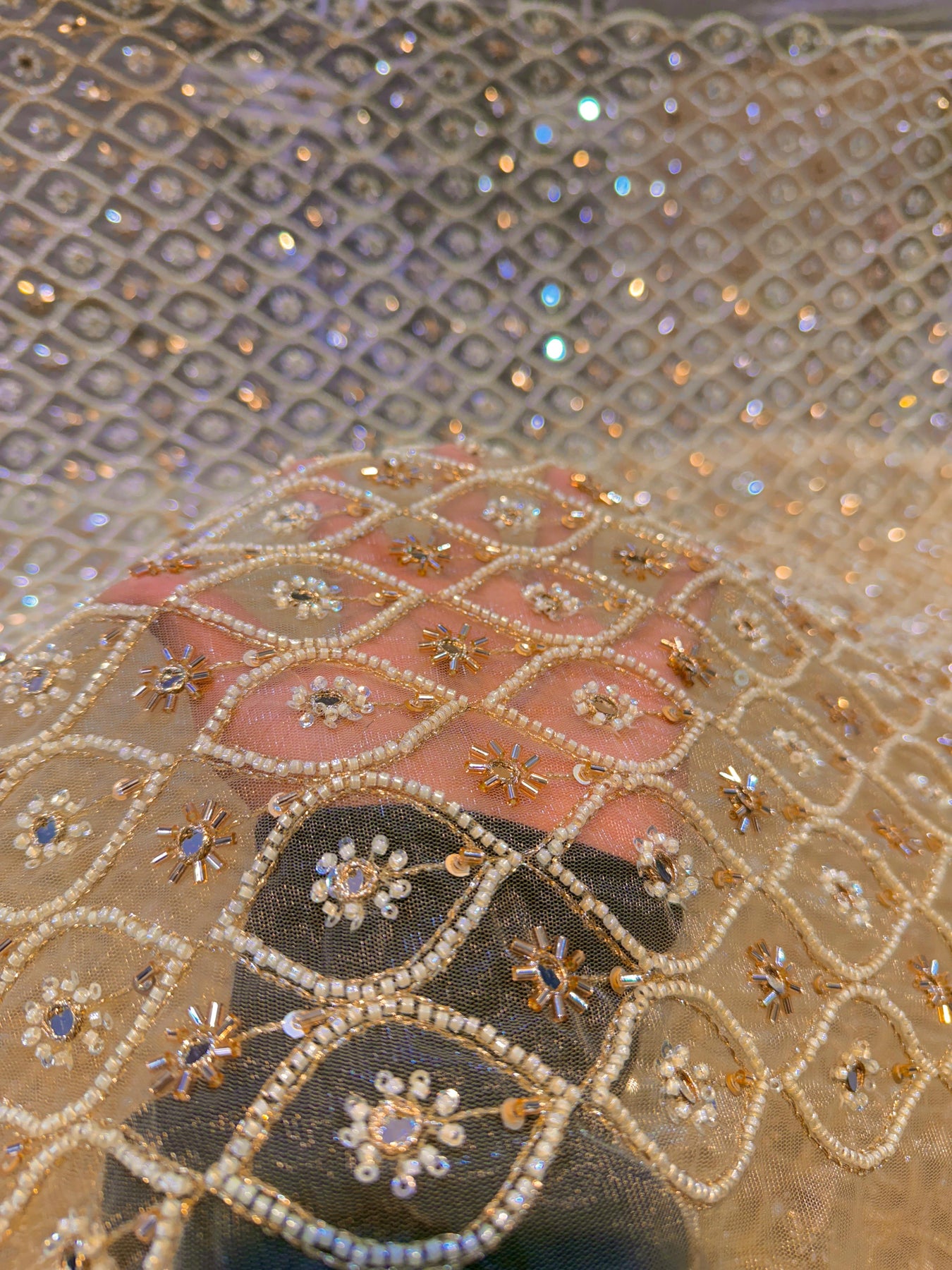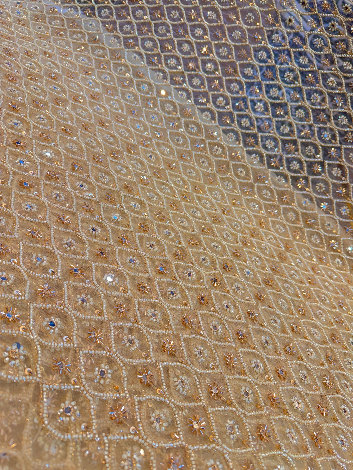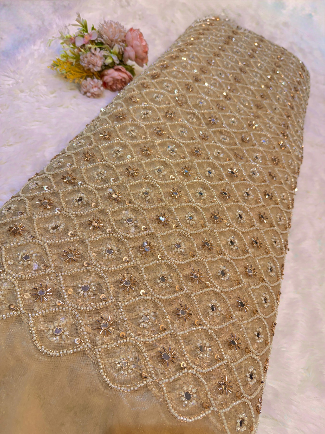 Elevate your ethnic and contemporary designs with this exquisite beige handwork net embroidery fabric. Featuring intricate hand-embroidered detailing on premium net base, this 44-inch wide textile offers versatility for creating stunning dresses, tailored suits, and traditional lehengas. The delicate embroidery work adds sophistication and visual depth, making it ideal for both festive occasions and everyday wear. Perfect for designers and home sewers seeking quality embellished fabric with authentic craftsmanship. Transform your creative vision into wearable art with this refined embroidery net. |