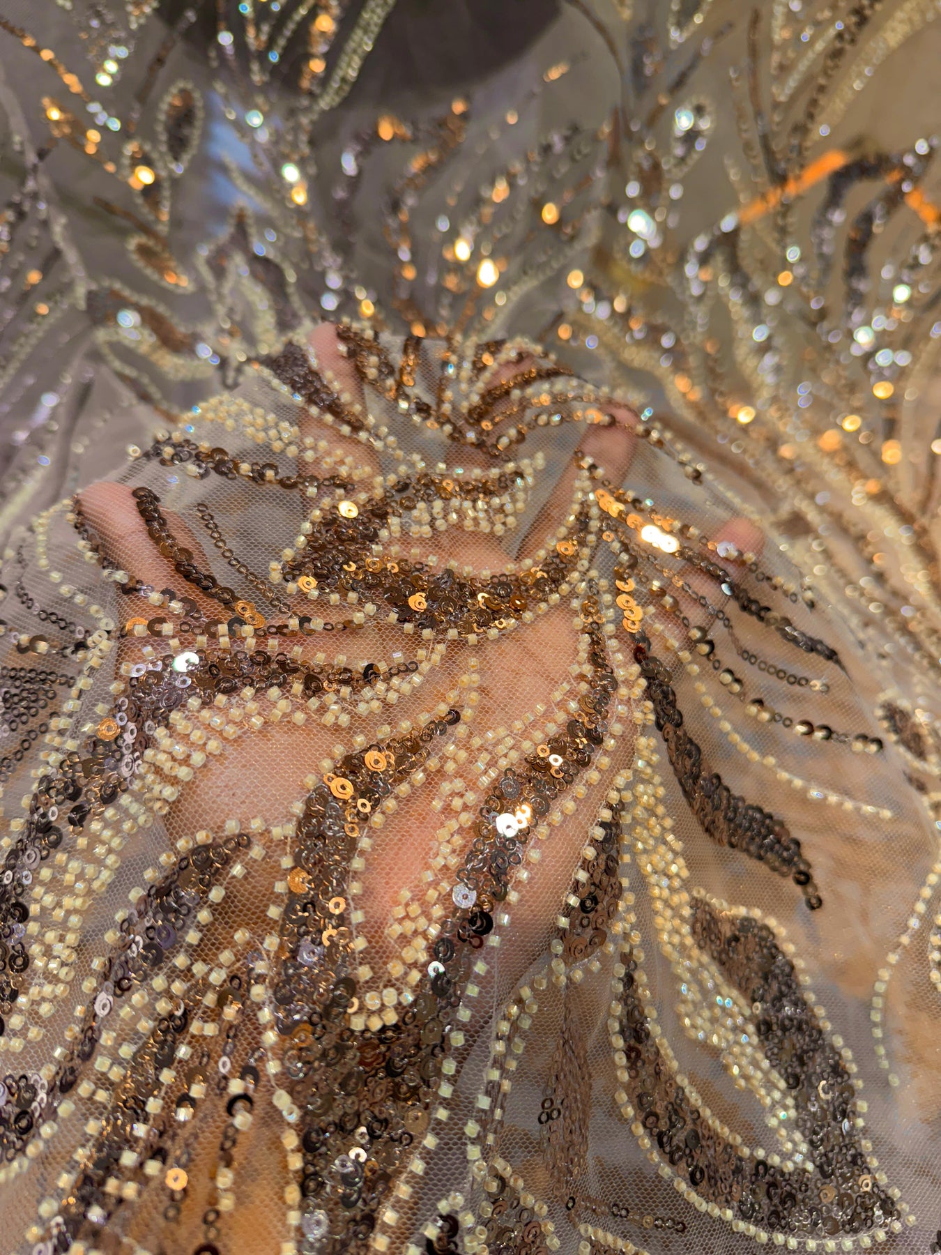 (Precut of 0.70 Meter) Keo Beige Handwork Net Embroidery 50 inch width