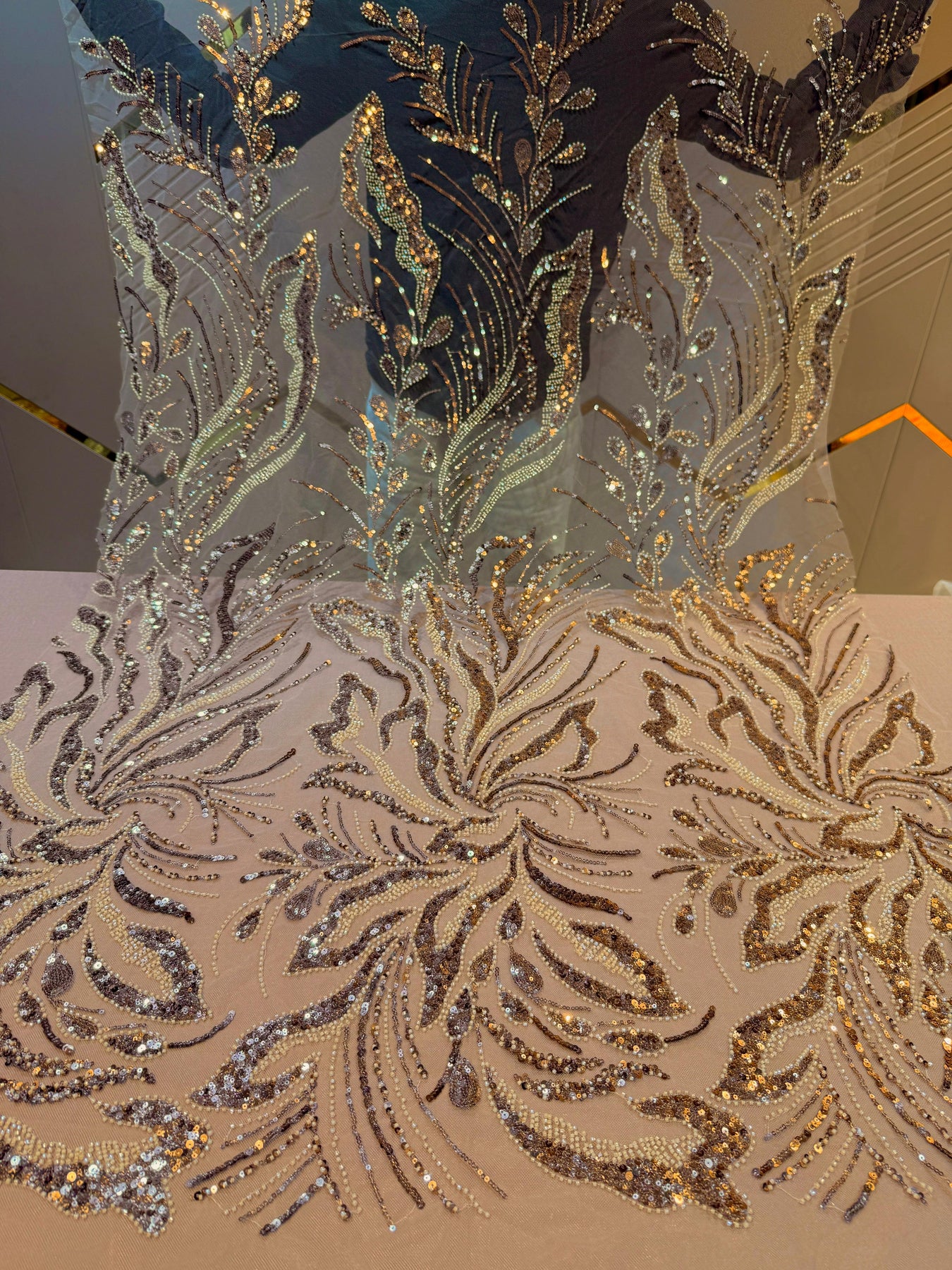 Keo Beige Handwork Net Embroidery, with a 50-inch width, offers exquisite craftsmanship perfect for creating elegant gowns, lehengas, and blouses. This delicate net fabric features intricate hand embroidery, adding refined texture and a luxurious touch to your designs. Its versatile width and lightweight nature make it ideal for detailed garment work while ensuring comfort and style. Elevate your fashion projects with this premium embroidery fabric designed for sophisticated and graceful apparel. |