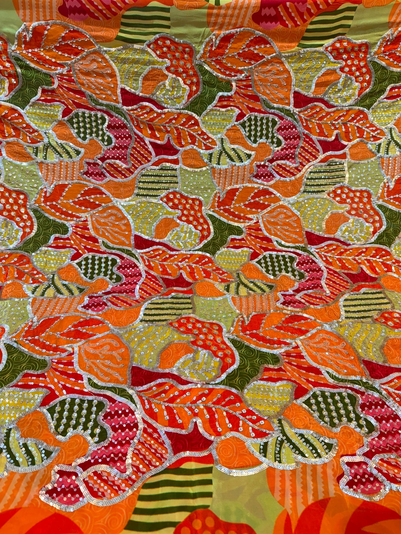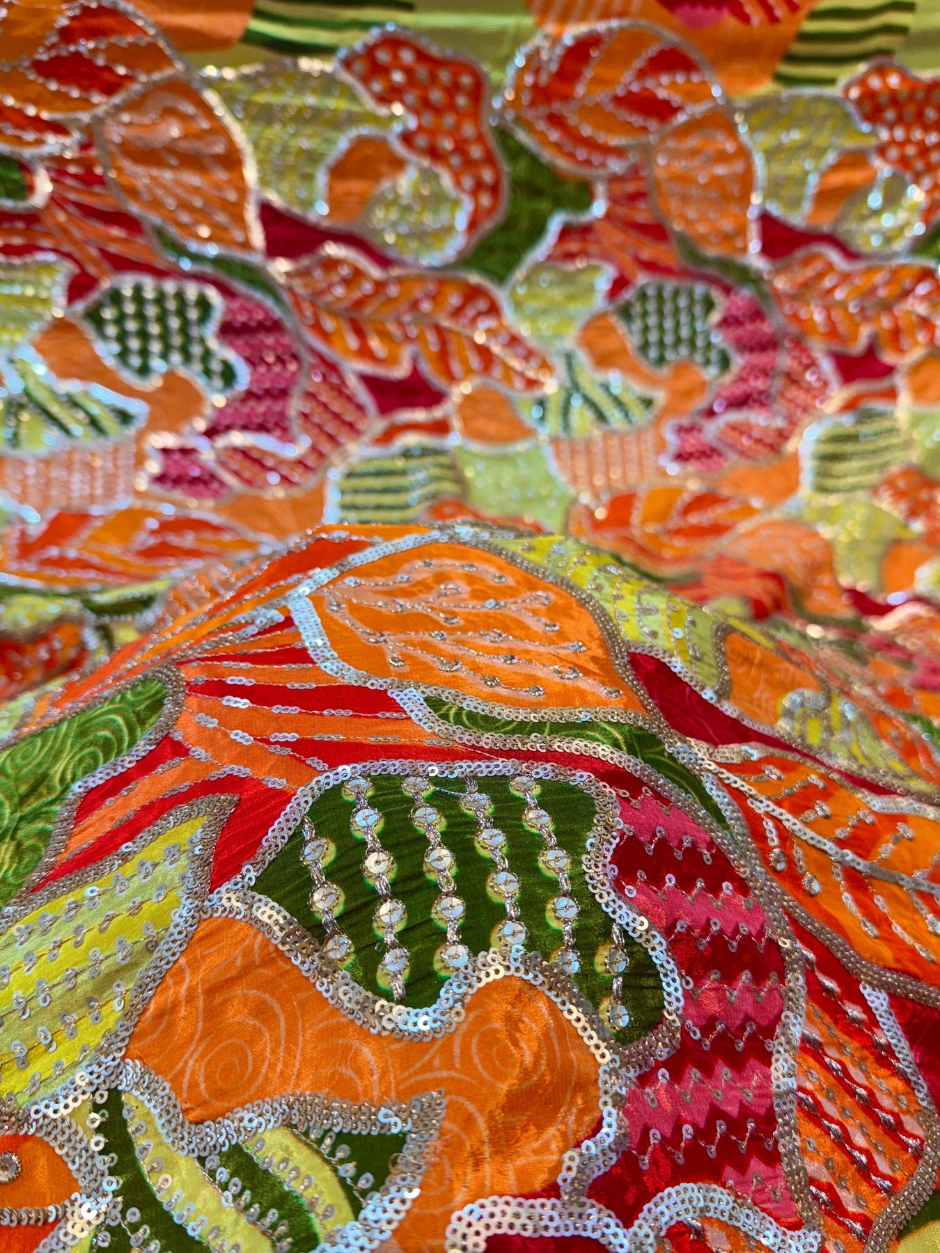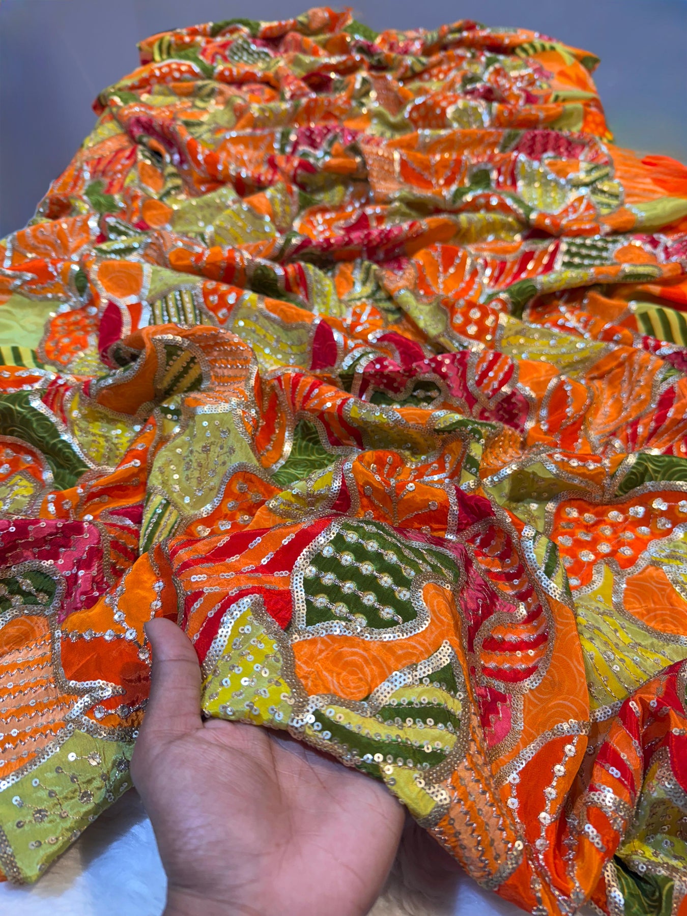 This elegant Pure Crape fabric features orange floral embroidery and sparkling sequins, perfect for creating stunning dresses, coordsets, blouses, sarees, and more. Made from high quality material, this fabric offers superior durability and luxurious softness. Upgrade your wardrobe with this versatile and eye-catching fabric.