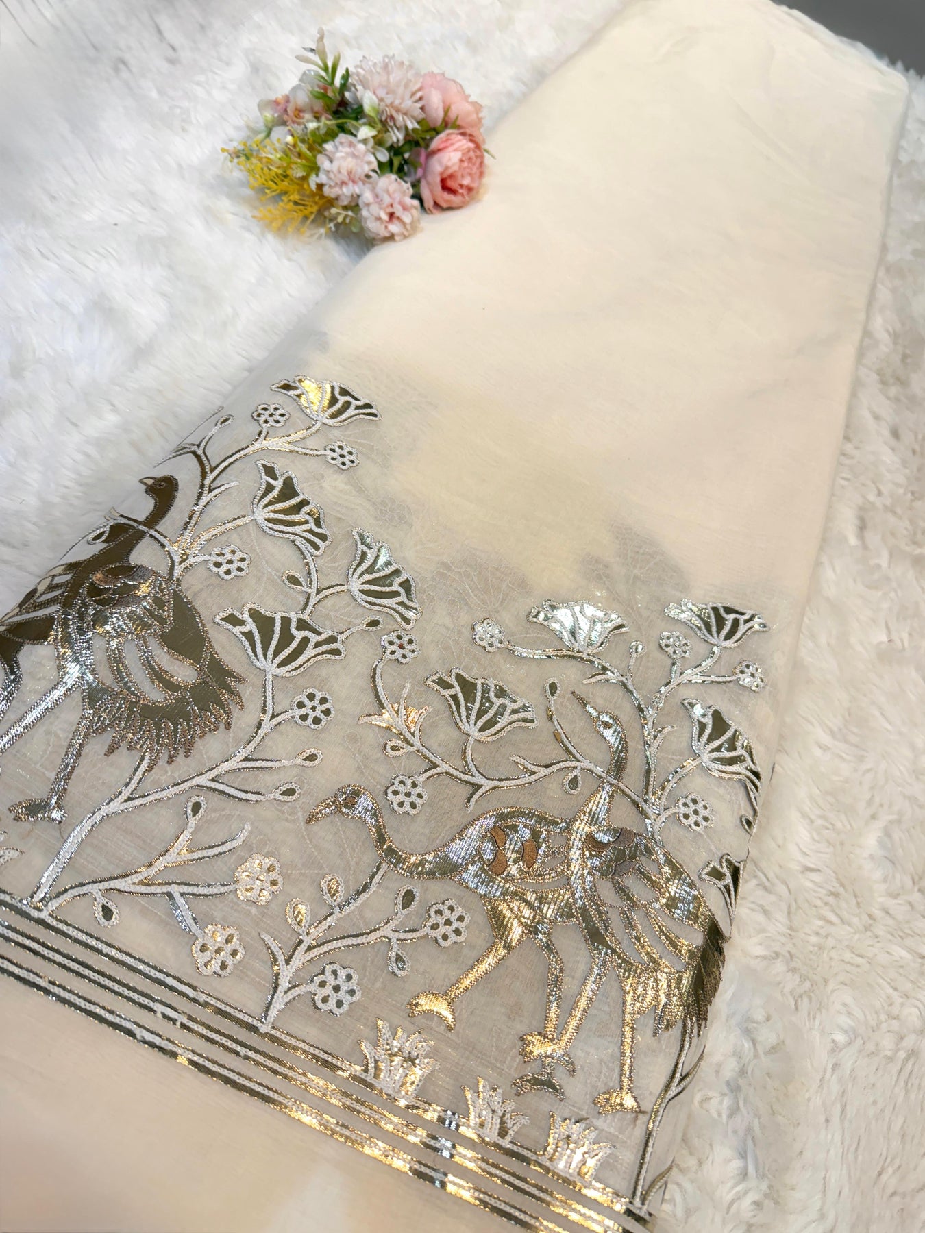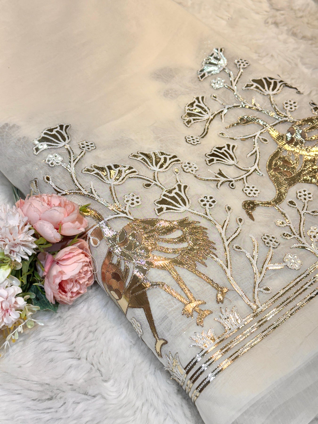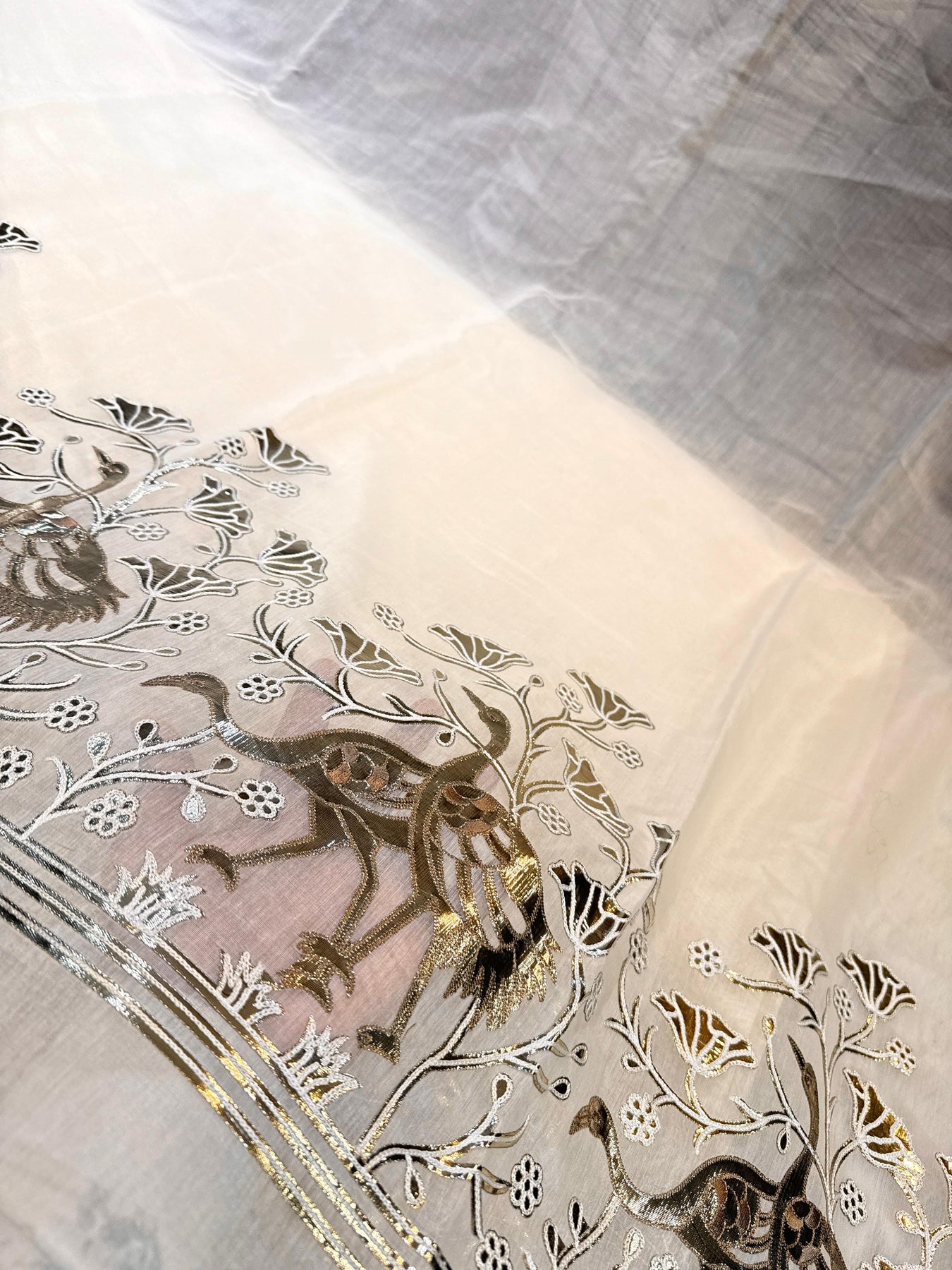Pure mul Chanderi with leather foil work 48 inch width Dyeable