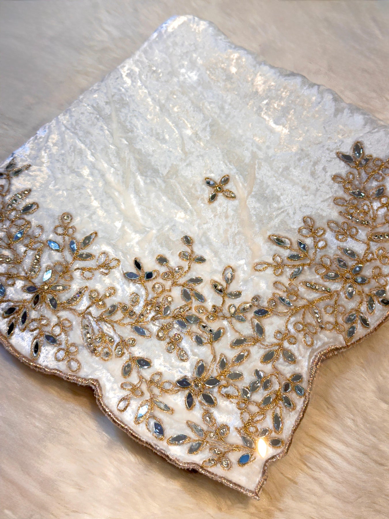 This luxurious dupatta features pure velvet fabric adorned with intricate real mirror handwork, enhancing its rich texture and visual appeal. With scalloped borders on all four sides and a generous length of 2.40 meters, it offers versatility—perfectly complementing suits, lehengas, gowns, or even worn as an elegant shawl. Its exquisite craftsmanship and premium material ensure it adds a sophisticated touch to any ensemble. |
