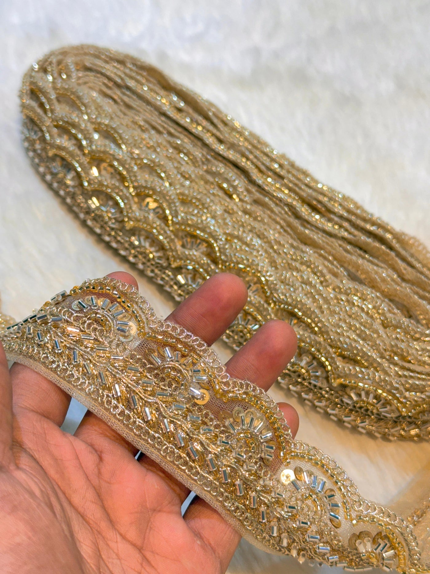Enhance your creations with this wholesale pack of 9 meters of exquisite lace border featuring intricate cutdana and sequins embellishments. Perfect for adding a refined touch to dupattas or elevating garment designs, this lace border offers both elegance and versatility. Its delicate craftsmanship ensures a luxurious finish that enhances the aesthetic appeal of your fabrics, making it an ideal choice for professional designers and artisans.