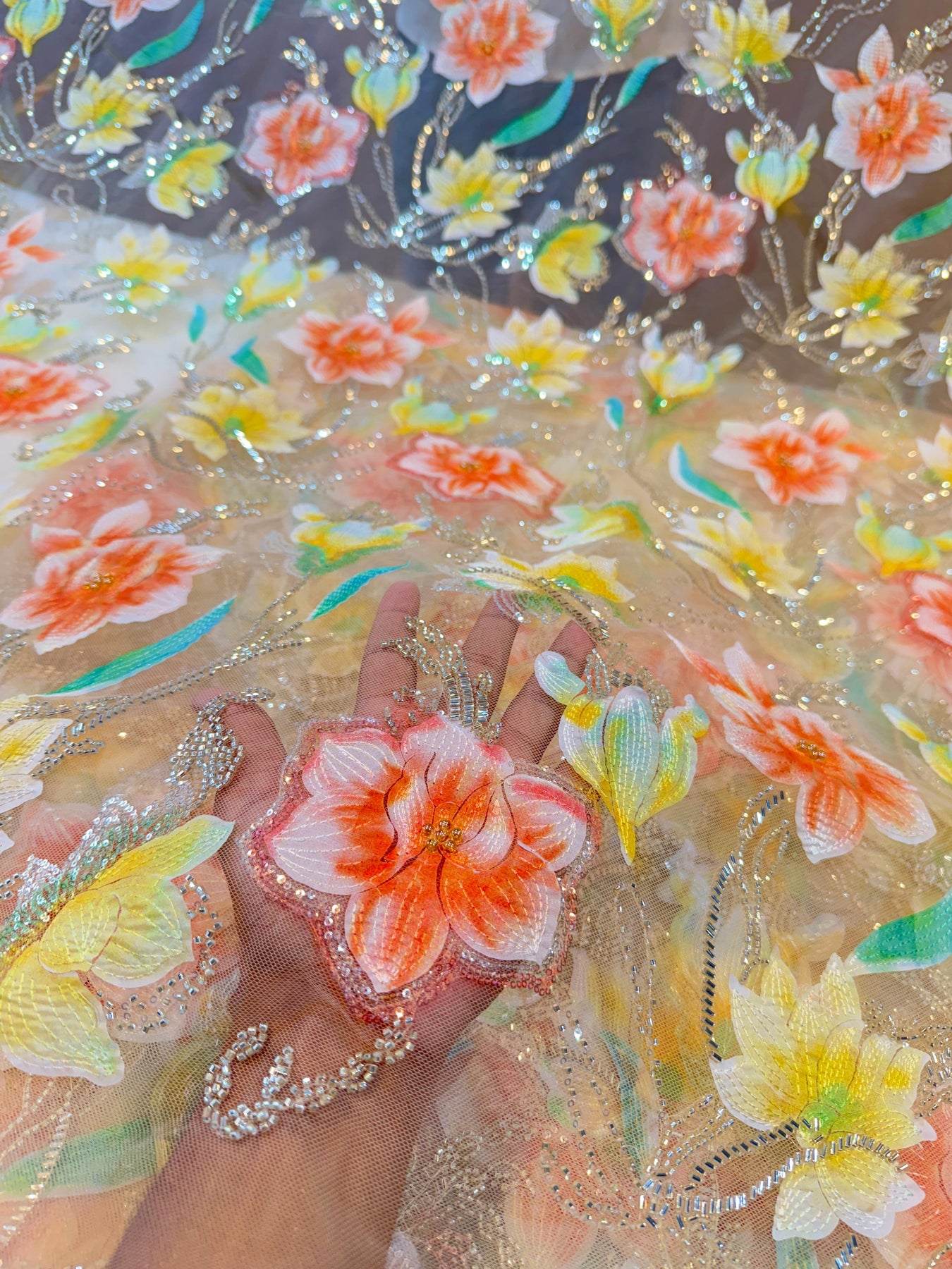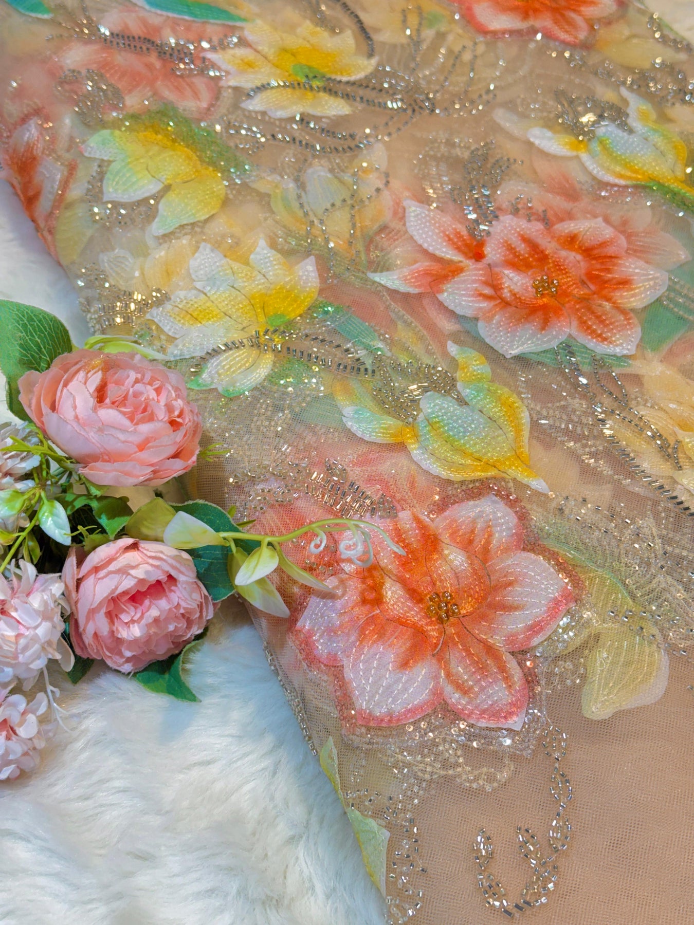 Zoya Appliqué Handwork Net Embroidery features intricate floral designs on delicate net fabric with a 54-inch width, ideal for crafting elegant dresses, gowns, and lehengas. The fine appliqué and detailed hand embroidery add texture and depth, ensuring each garment radiates sophistication and artisanal quality. Perfect for designers seeking premium materials to create standout ethnic and formal wear.