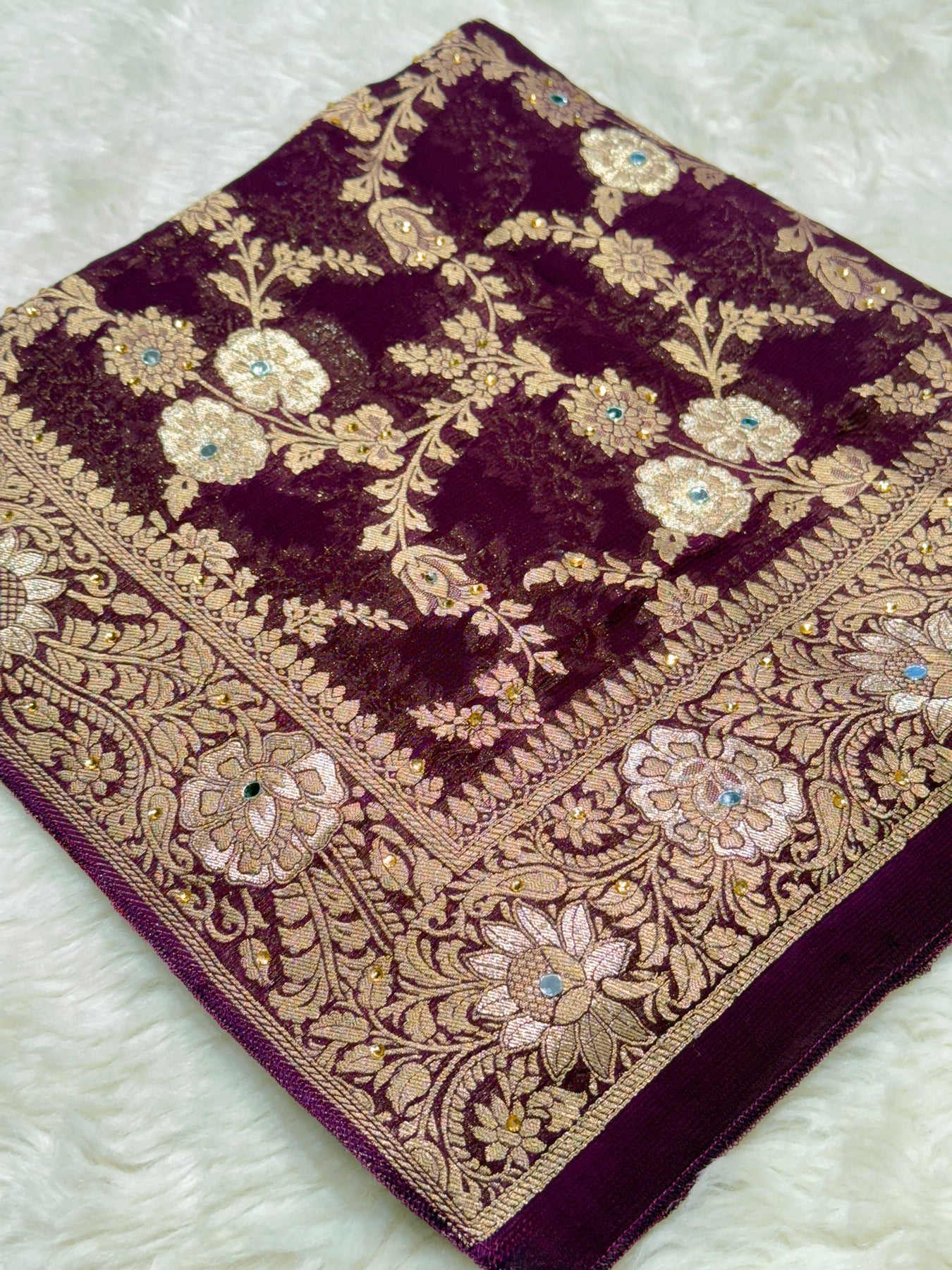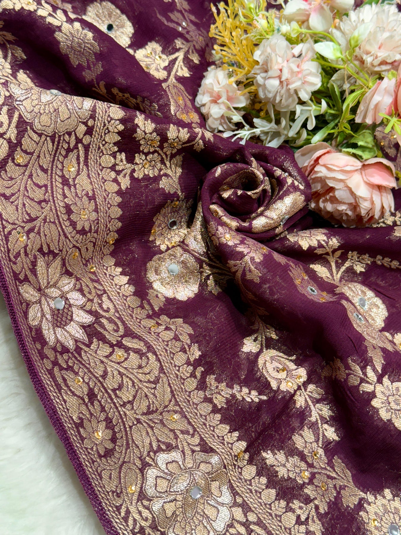 Sandook Wine Pure Georgette Banarsi Dupatta With Handwork 2.50 Meter length